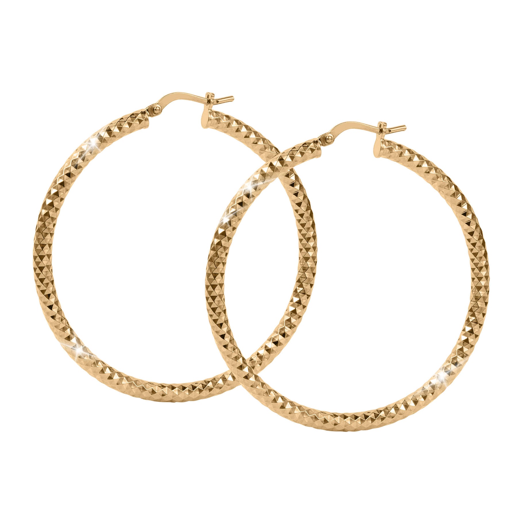 Crafted in Italy with a luxurious yellow gold finish, these statement 40mm hoop earrings complement classic style with diamond cut detailing that catches the light from every angle. This multi-functional size is the perfect expression of your style for standout sparkle. Sleek, standout and effortlessly radiant, they add a sophisticated shimmer to any outfit.