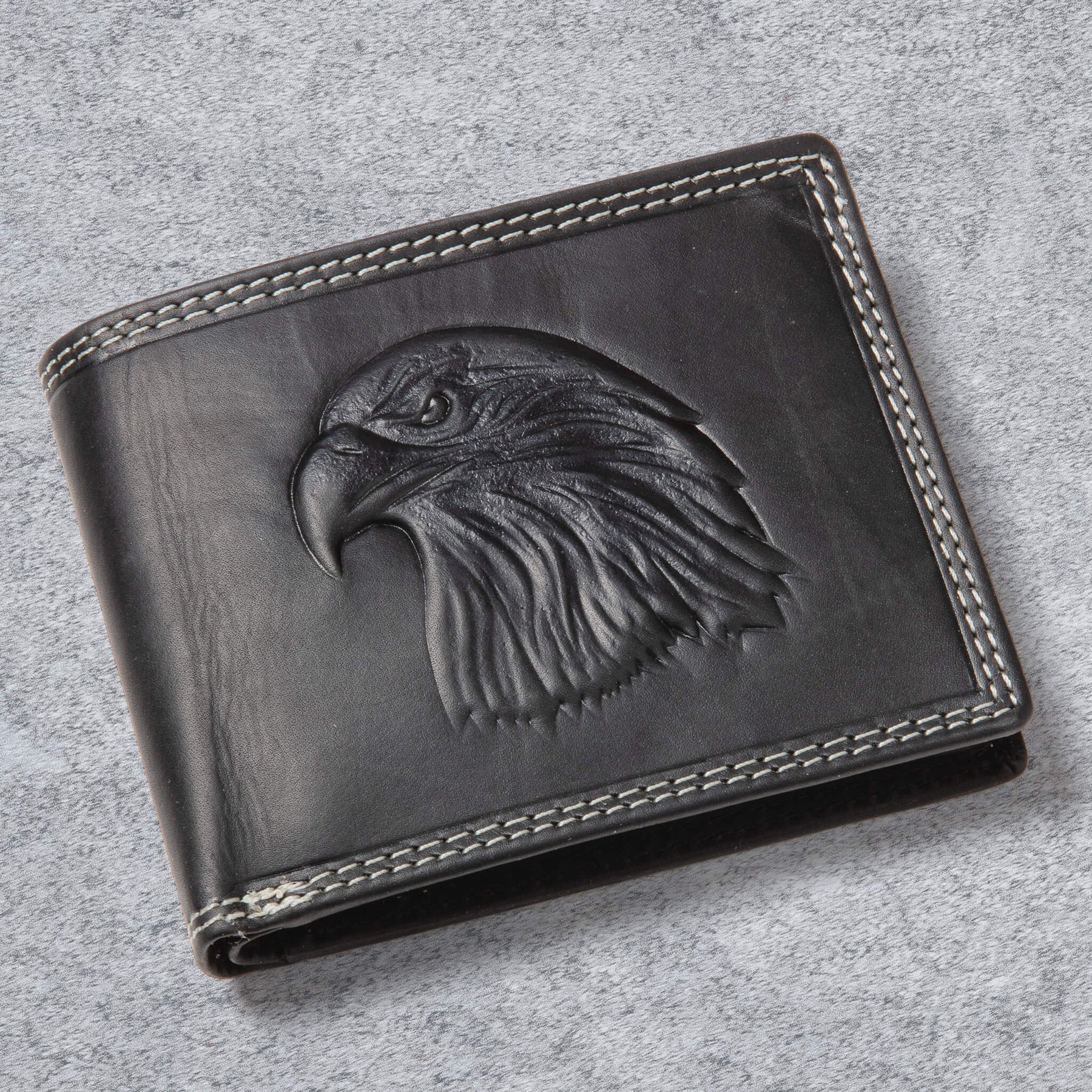 Handcrafted from the finest leather, this wallet offers both standout style and modern practicality. This wallet provides ample space with dedicated compartments for notes and cards, while built-in RFID protection shields your information from unwanted scanning. The sleek black style showcases a striking eagle head, embodying vision and freedom. It is finished with bold white contrast stitching, creating a piece that blends craftsmanship with distinctive character. Upgrade your everyday essential with security, style and practical storage.