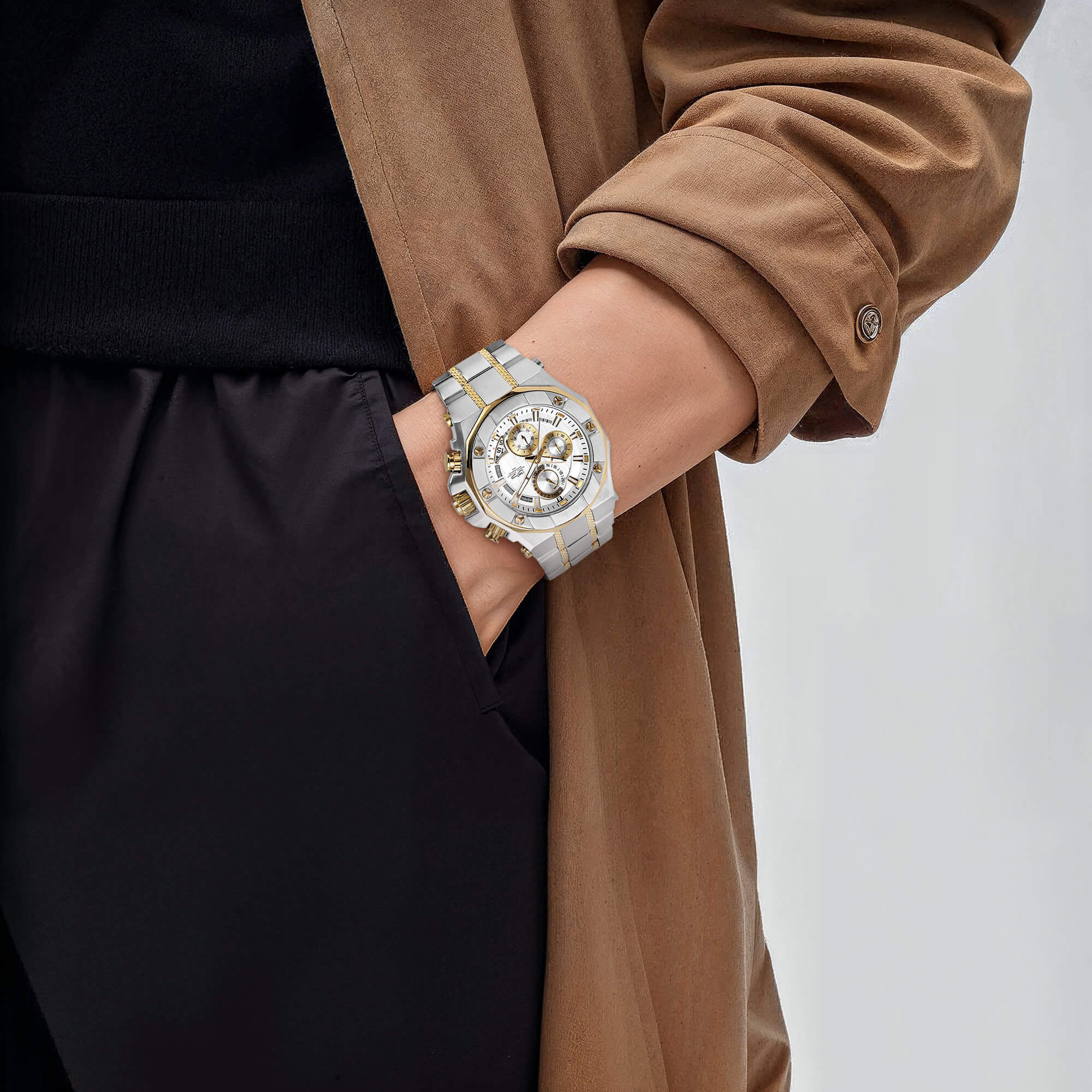 We are delighted to bring this stunning watch to you at an affordable price. Engineered from premium grade 316L steel and plated in a mixture of rose gold and black IP, the words designer styling really could have been invented for this timepiece. A precision chronograph movement works away silently under the multi leveled dial.