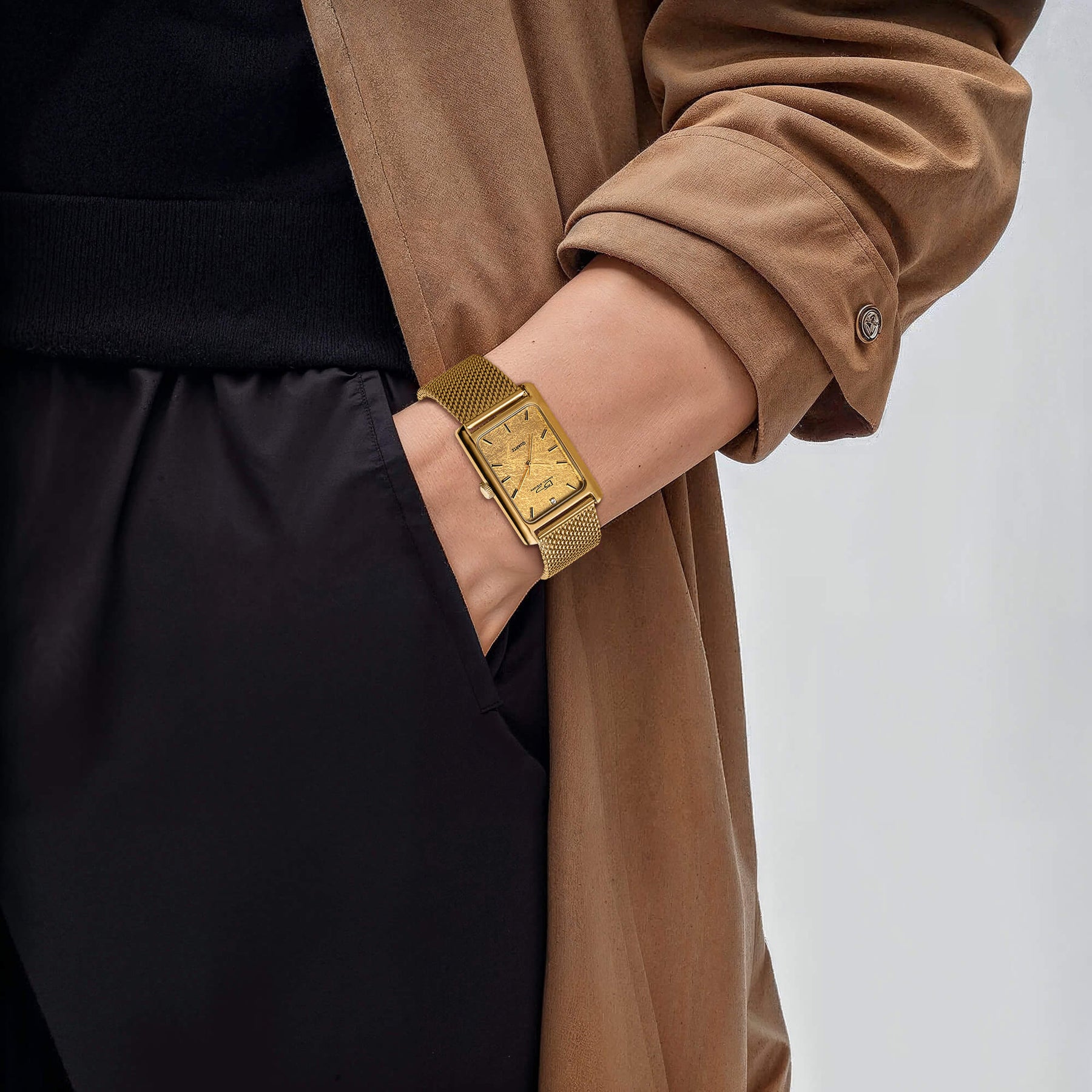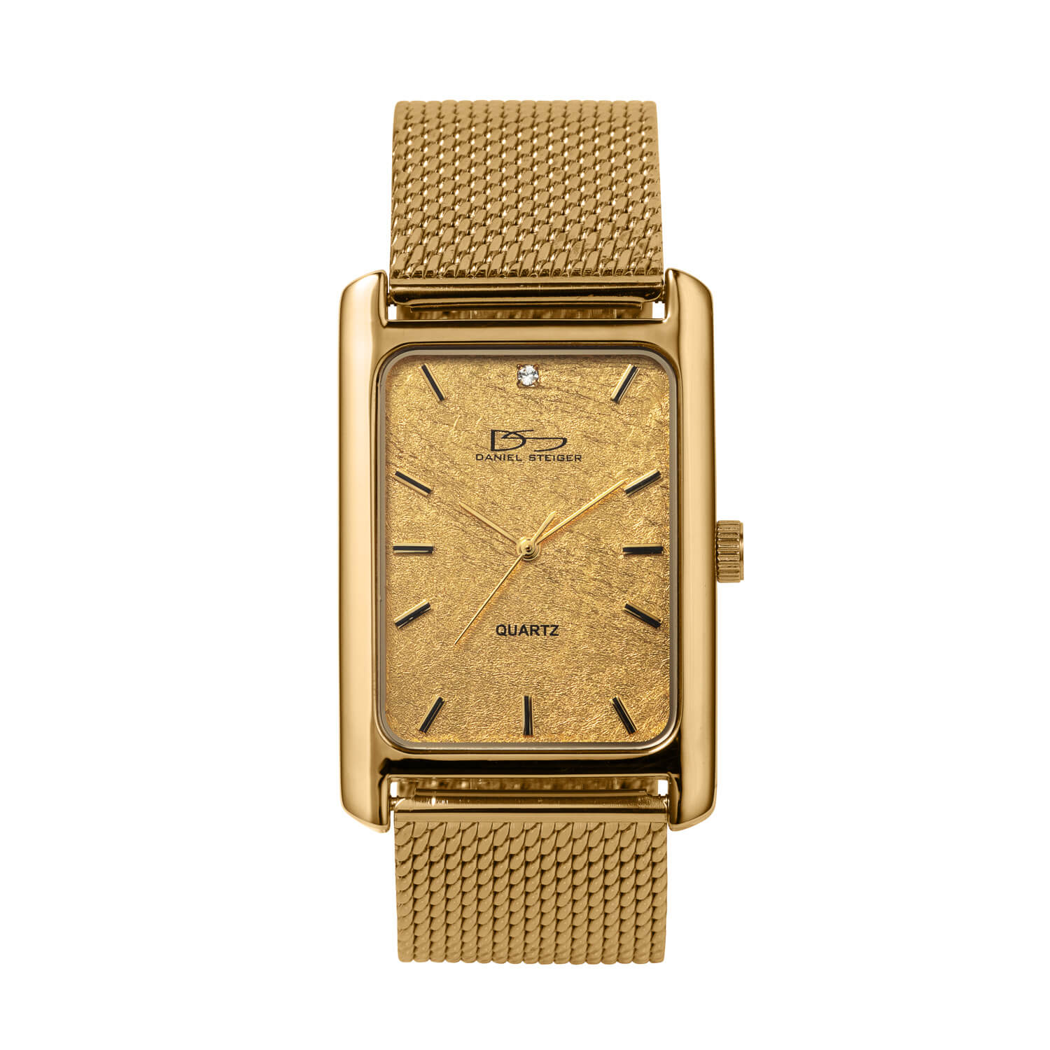 Time has never looked this good! The classic rectangular case is given contemporary details. A stainless steel, comfort mesh strap finished in yellow gold is paired with a rectangular case. The 24k gold foil dial is sure to impress, with a solitaire Diamondeau®, flawless simulated diamond, positioned at 12 o’clock. An easy to read 3 handed movement gives you a timepiece you will want to wear always.