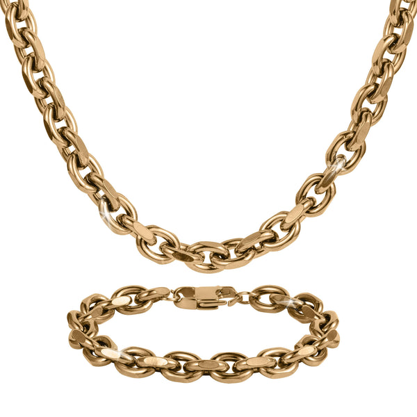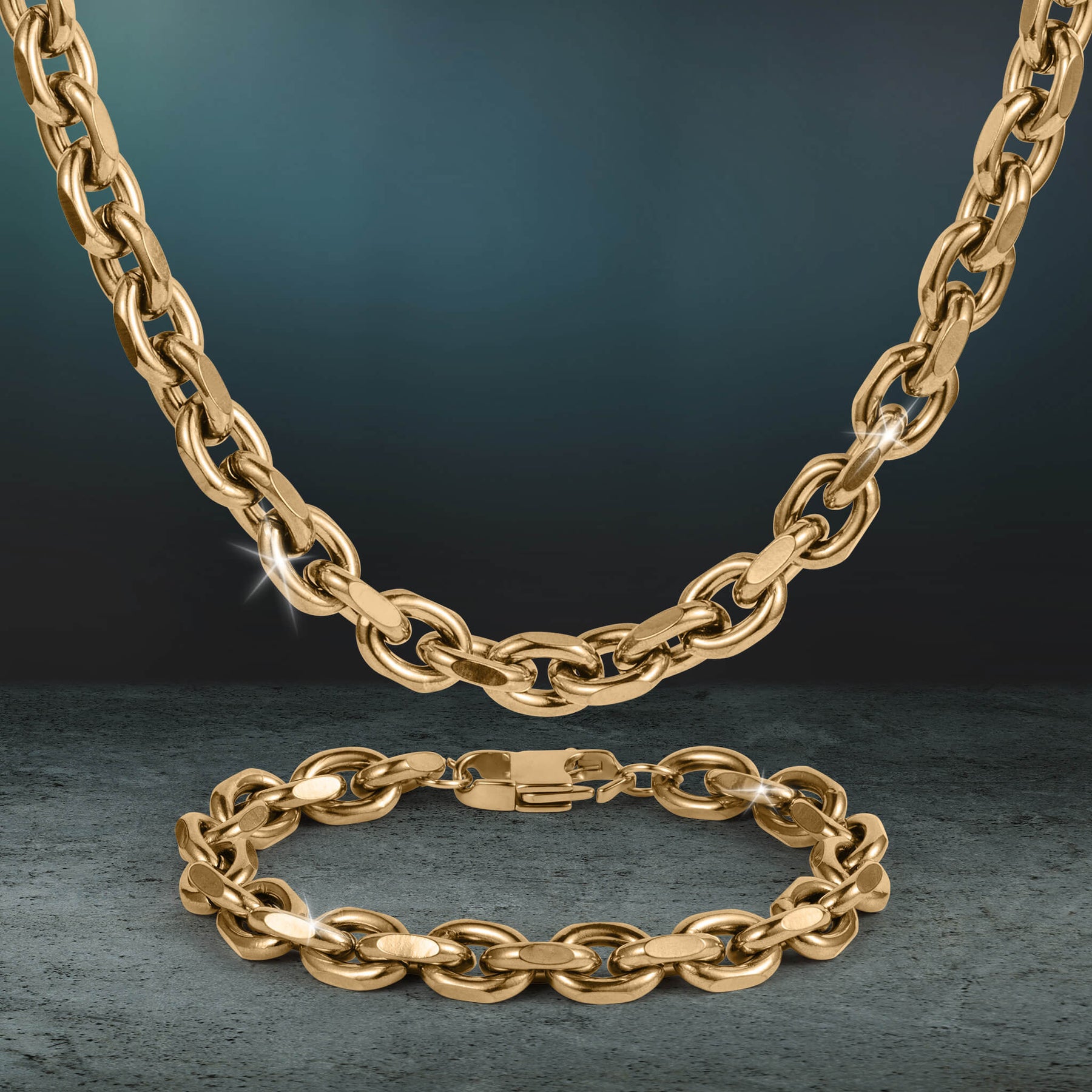 Bold and confident, this men’s chain necklace and matching bracelet set is a statement of strength and refined style. Crafted with solid, interlocking links and finished in rich yellow gold, each piece delivers a powerful presence without sacrificing sophistication.The secure lobster clasp ensures durability and ease of wear, making this set ideal for daily use or elevated occasions. Designed to be worn together or styled separately, the classic link silhouette pairs effortlessly with both casual and formal look.