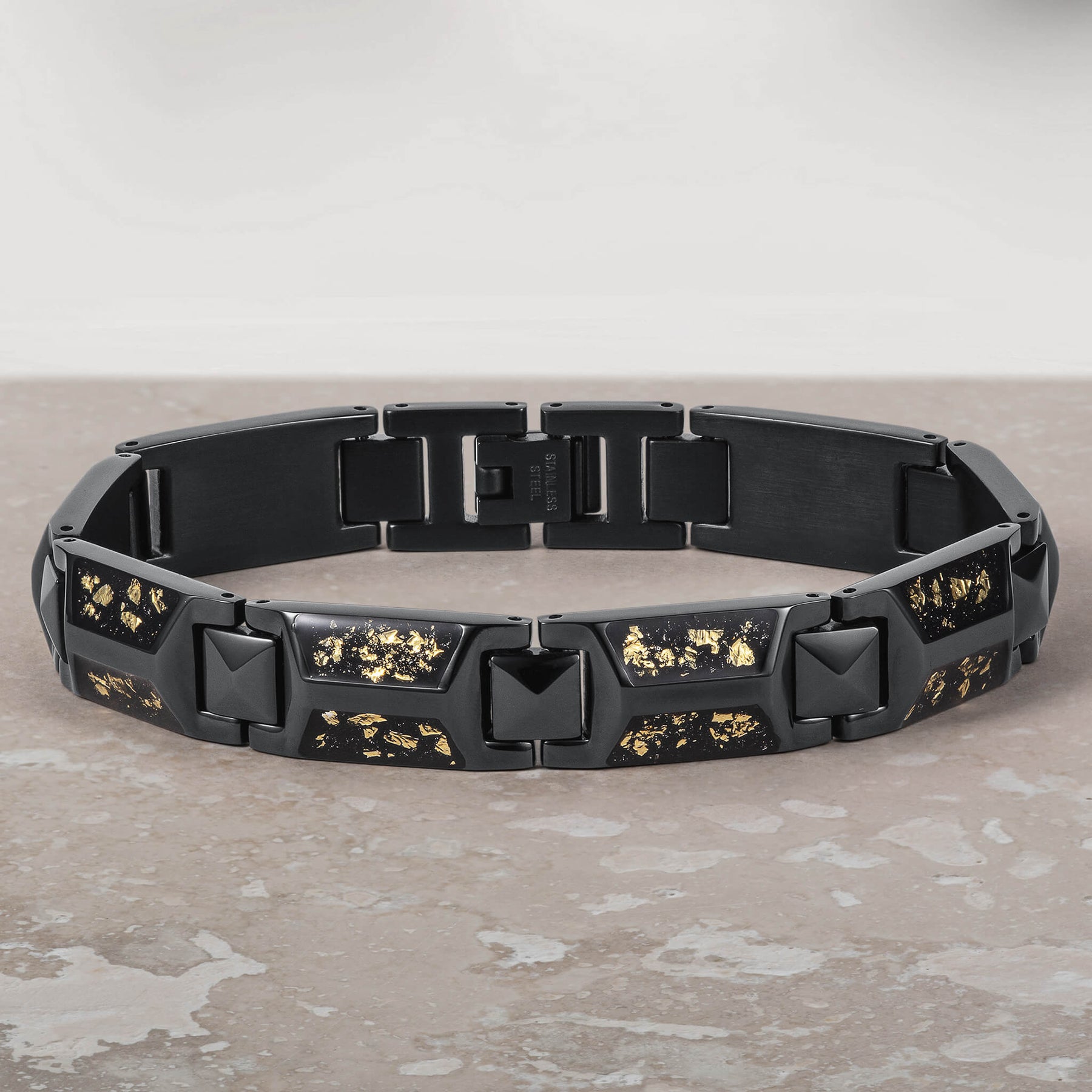 This beautiful collection captures the quiet power of a light that refuses to fade. Deep black tones cradle shimmering gold, like embers glowing in the stillness of night. Each piece is crafted from stainless steel, finished in rich IP black and adorned with genuine 14K gold leaf. It is a fusion of strength and radiance. At the heart of the pendant lies an inner cross, set with brilliant Diamondeau®, flawless simulated diamond, capturing and reflecting every hint of light. Created for those who find their strength in stillness.
