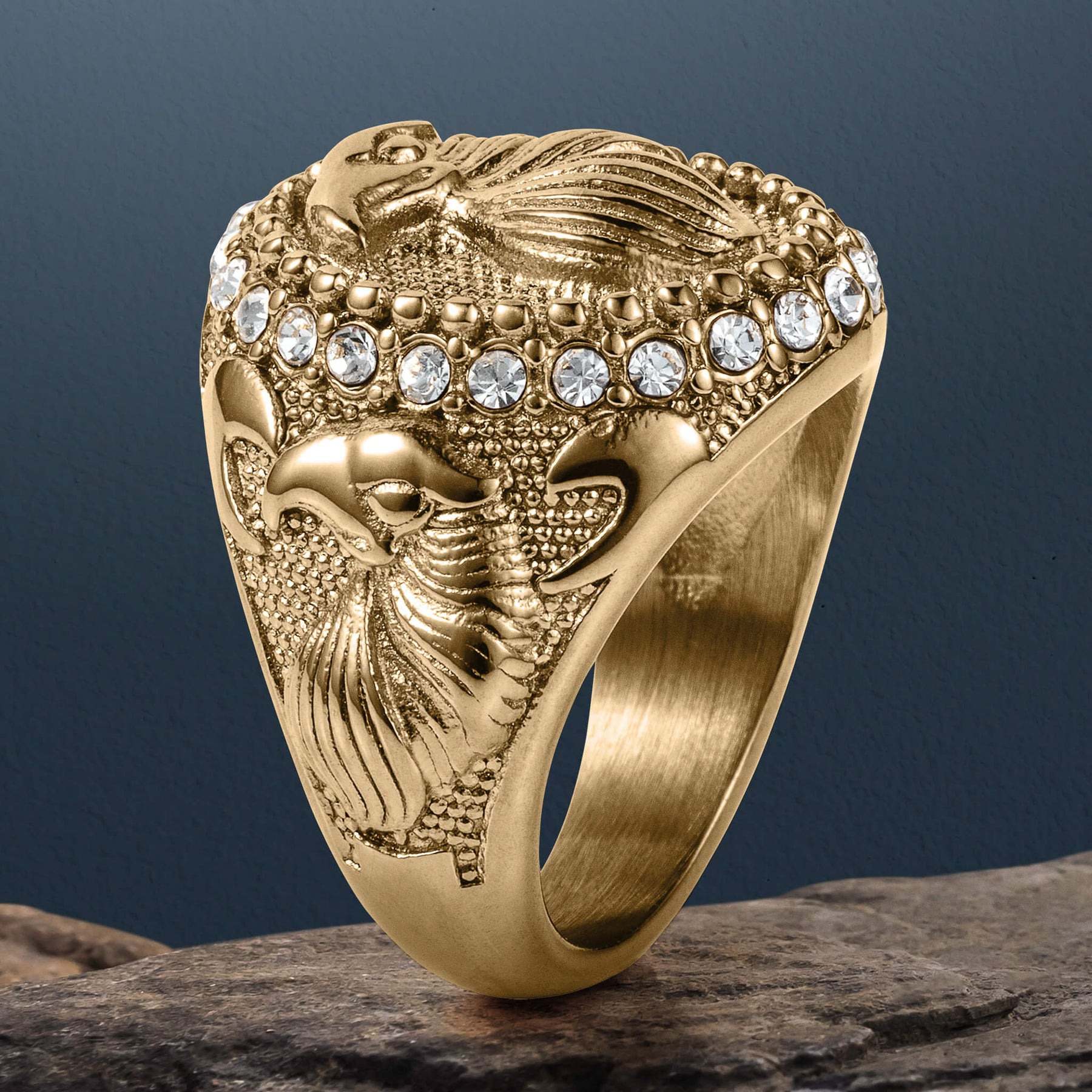 Crafted from premium stainless steel and finished in rich yellow gold, this ring delivers a bold presence with a refined edge. A radiant halo of Diamondeau®, flawless simulated diamond frames the center, catching light with every movement and adding a touch of brilliance to its powerful form. The detailed eagle design, echoed not only on the face but also along the shoulders, reinforces its commanding character. The eagle has always stood as a symbol of freedom, strength, courage, and unwavering independence. This piece channels that iconic emblem, reimagined for those who appreciate meaning wrapped in bold design.