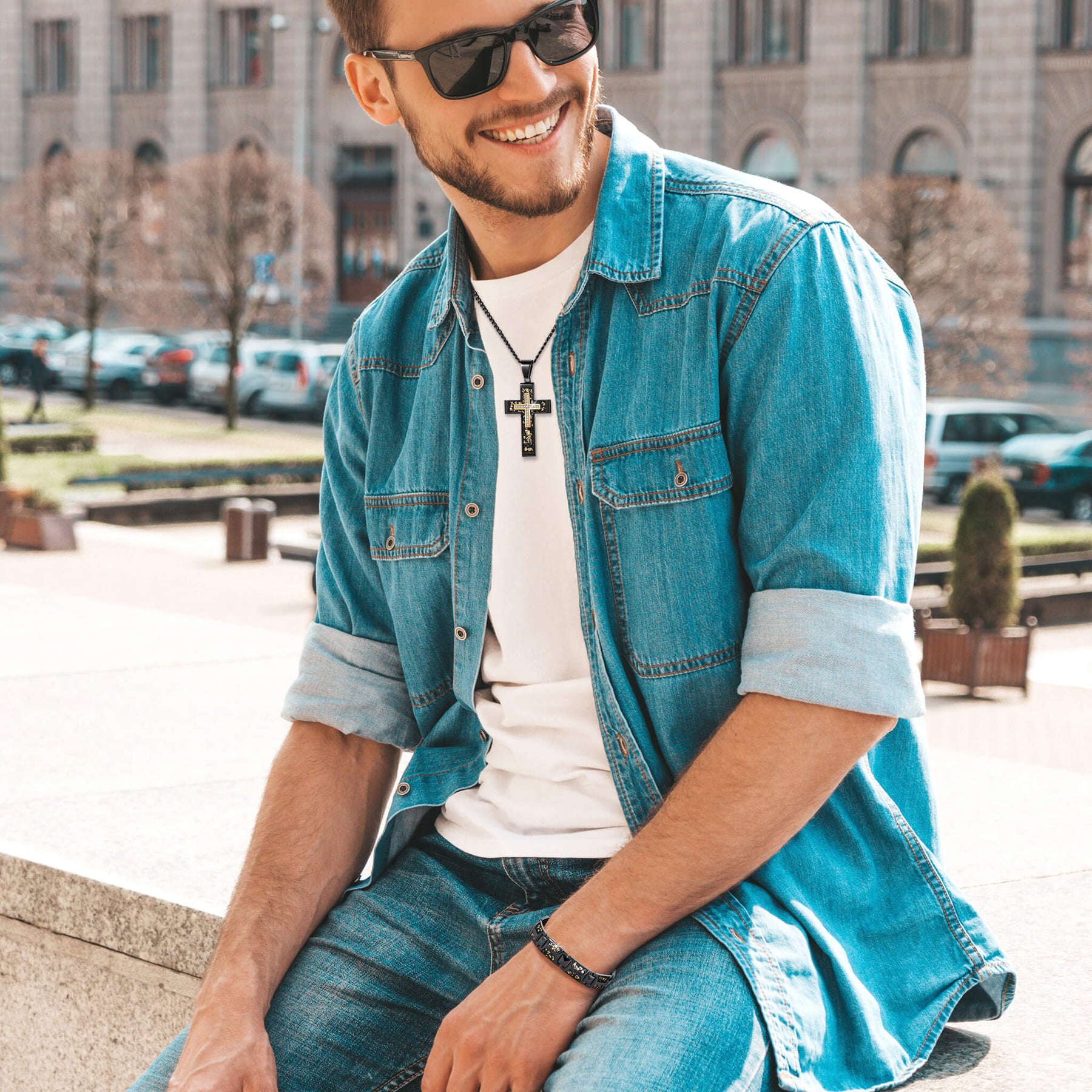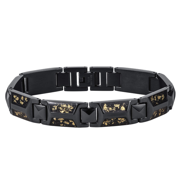 This beautiful piece captures the quiet power of a light that refuses to fade. Deep black tones cradle shimmering gold, like embers glowing in the stillness of night. The bracelet is crafted from stainless steel, finish in rich IP black and adorned with genuine 14K gold leaf. It is a fusion of strength and radiance. Created for those who find their strength in stillness.