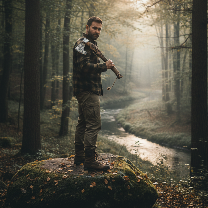 Powerful, precise, and steeped in Norse heritage, this formidable 20" axe blends rugged performance with handcrafted beauty. The 5" hand forged high carbon steel blade is treated for long lasting sharpness and edge retention, while its 6mm thickness delivers relentless chopping force. The blade features a striking design of a Viking warrior’s face in a detailed helmet, positioned beside the Helm of Awe, a powerful Norse symbol of protection and strength. The solid burnt ash wood handle is wrapped in natural twine for a sure, comfortable grip. Carved with rune inspired markings, the handle design connects you to the ancient power of the warriors who once wielded such weapons. Built to perform, whether in the wild or on display, this axe excels at chopping, cutting, and breaking with unwavering force. A standout piece for practical use or display.