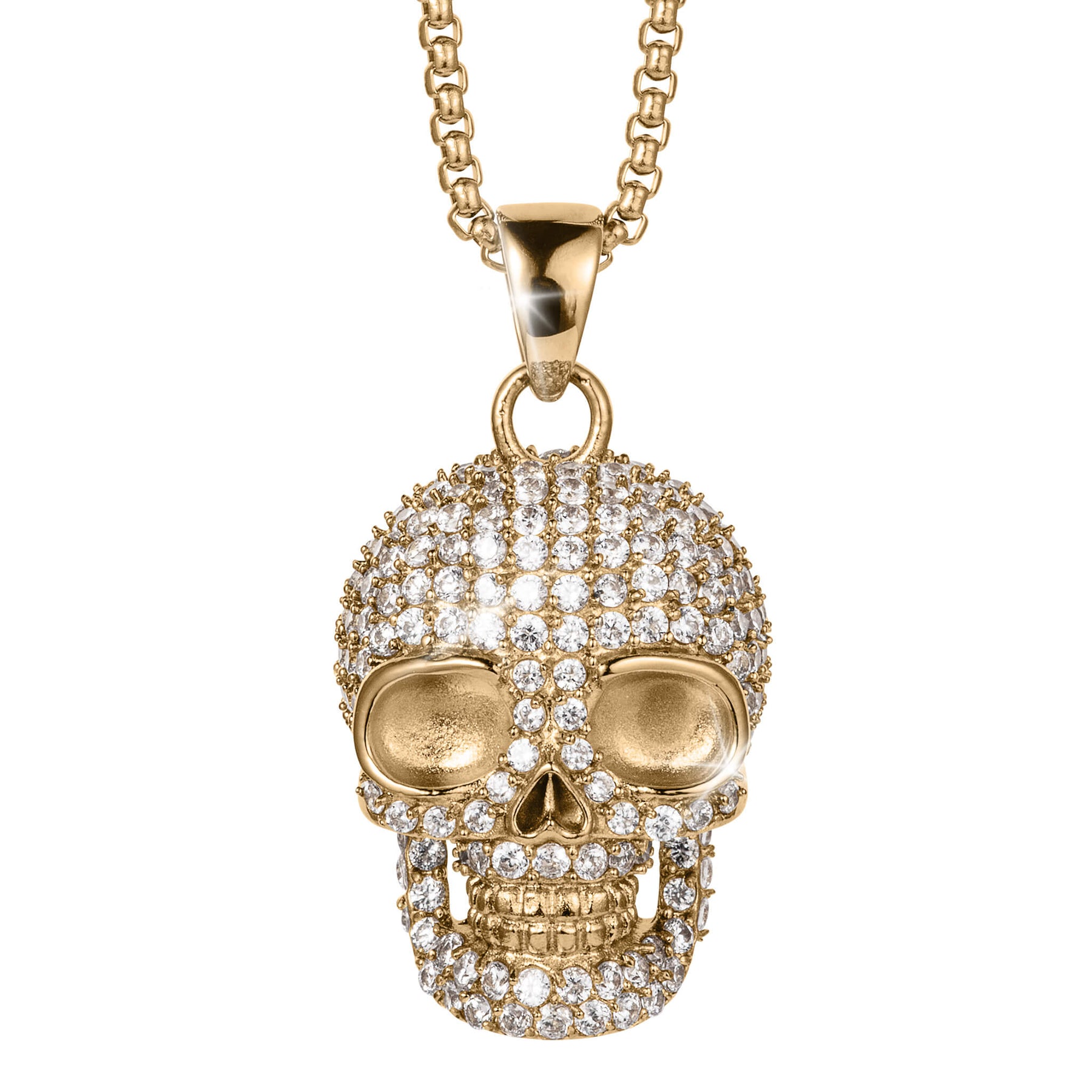 Make a statement that speaks of power, confidence, and individuality. This men’s gold-plated skull pendant is designed for those who don’t follow trends—they set them. Crafted from durable stainless steel and finished in a rich gold plating, this pendant offers lasting strength with a bold luxury appeal. The detailed skull design is fully iced with Diamondeau®, flawless simulated diamond, delivering maximum shine and undeniable presence from every angle. The solid construction ensures durability for everyday wear, while the polished finish provides a premium look that complements any outfit. Suspended on a matching chain, this pendant is more than jewelry—it’s an expression of attitude, resilience, and fearless character.