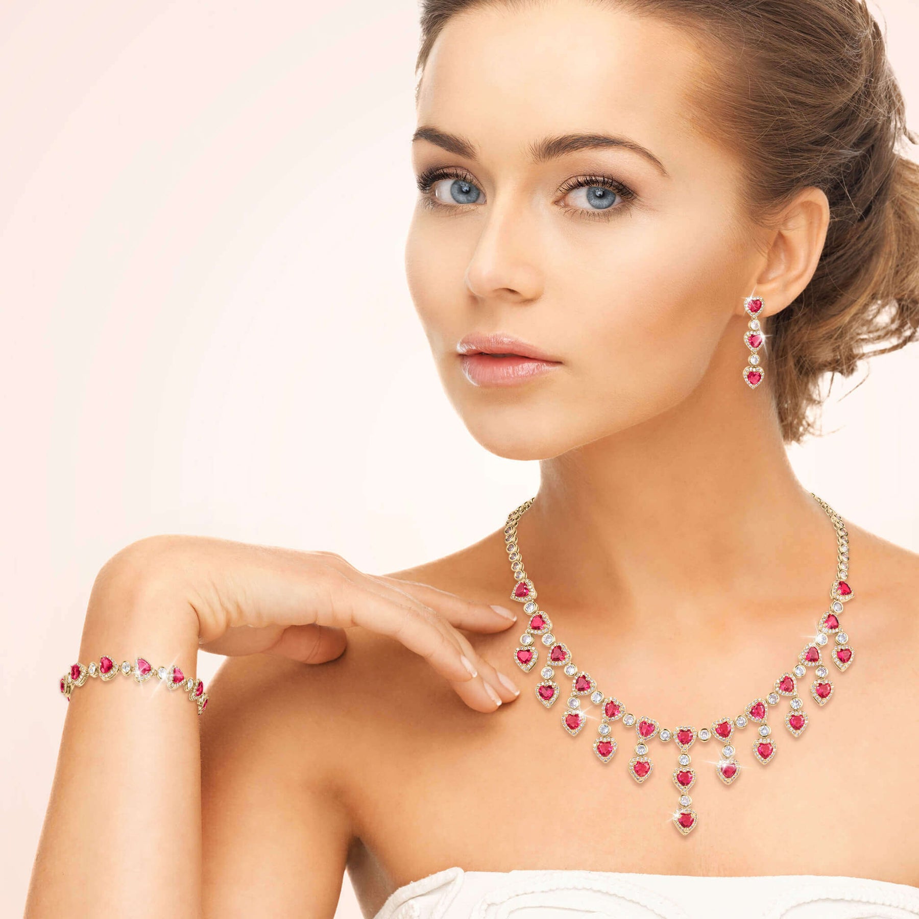 Finished in the warm glow of yellow gold, this collection radiates timeless sophistication. The heart-shaped Diamondeau®, flawless simulated diamond, shimmer with rich scarlet tones, perfectly complemented by delicate clear accents that catch and reflect the light from every angle. The heart shape has carried deep meaning for centuries; an enduring symbol of devotion since the Middle Ages, when it first appeared in art to represent spiritual and romantic love. Crafted with care and attention, each piece tells a story of love that transcends time. Perfect for romantic evenings, special celebrations, or as a luxurious everyday statement. It adds a touch of timeless romance to every occasion.