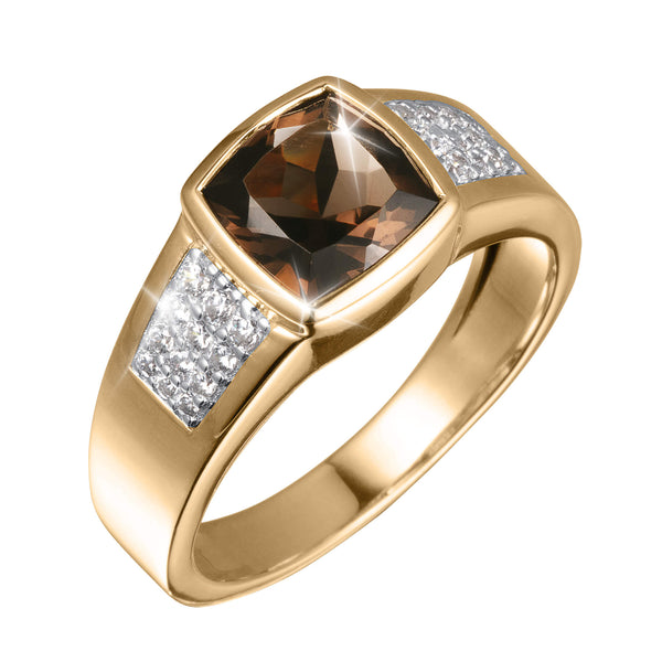 This men’s ring features a deep, dark cushion-cut, Smoky Quartz center stone set in a sterling silver, gold plated band, flanked by precision-set Diamondeau®, flawless simulated diamond accents on each side. The contrast between shadow and light creates a commanding presence - confident, modern, and unmistakably masculine. Designed for the man who values strength, legacy, and understated luxury.