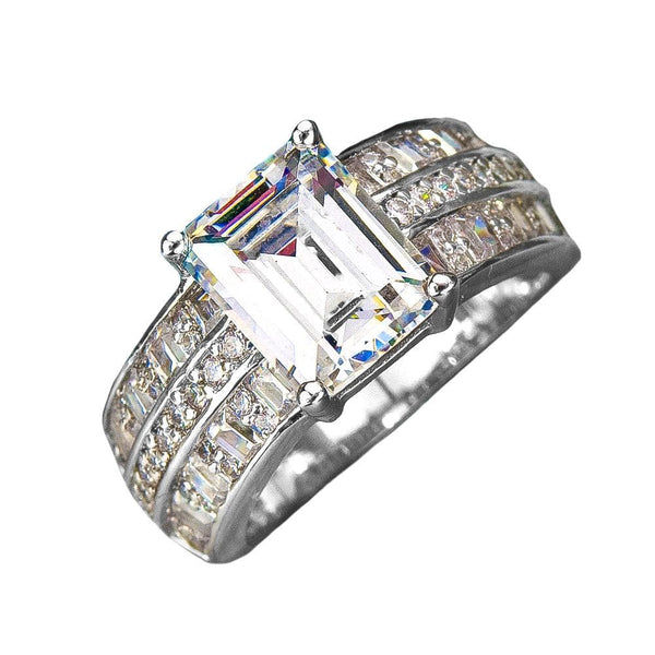 This beautiful ring is the perfect blend of a band and solitaire ring. A magnificent 3.5 carat green cut Diamondeau® - flawless simulated diamond is the star of this piece. The geometric lines of this stunning gem stone will reflect light to create a dazzling fire pit of sparkle. The solid 925 Sterling band is expertly channel set with a sophisticated mix of round brilliant and baguette stones which real designer look to this fine piece of jewelry. Magnificent presentation case included.