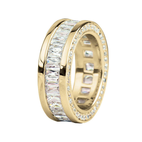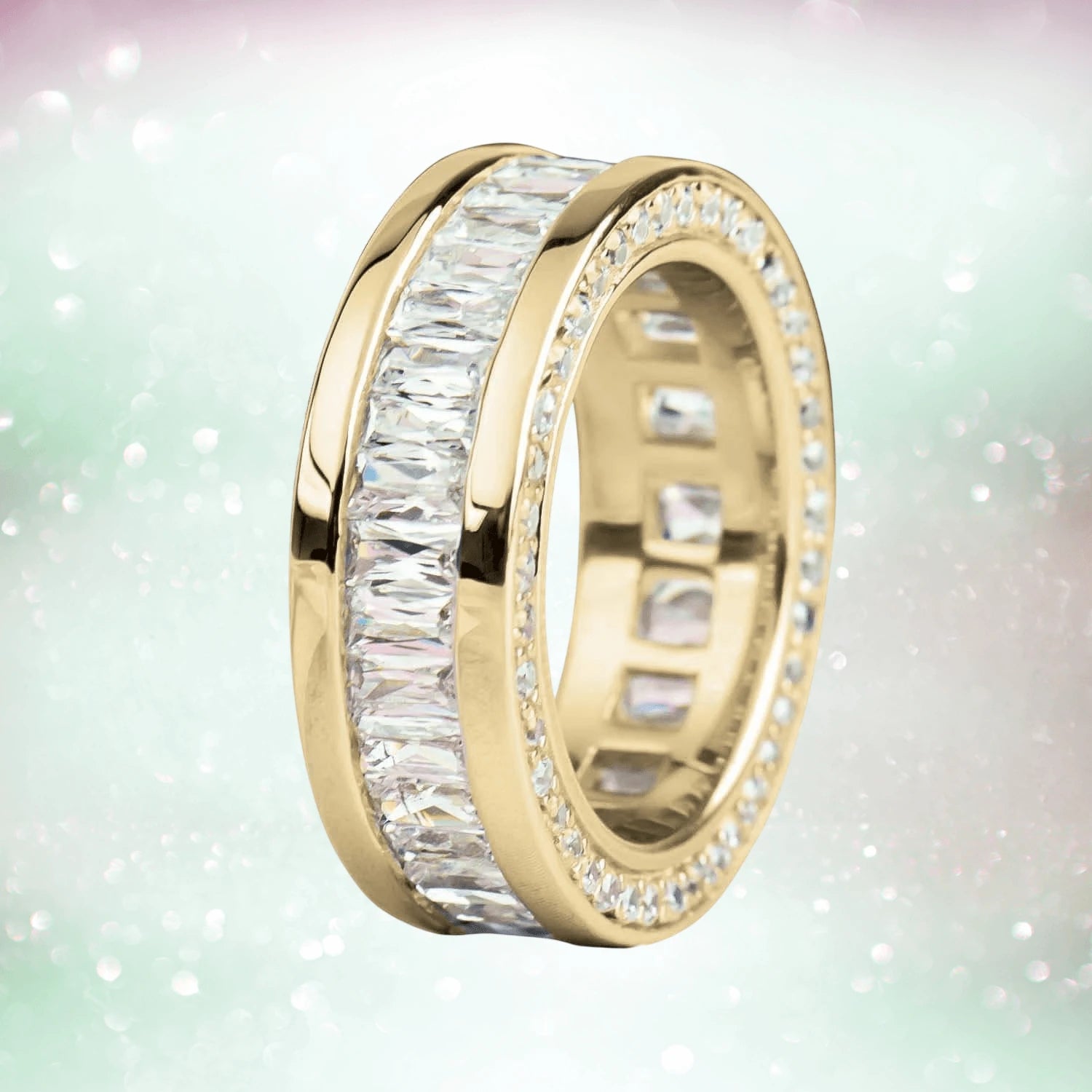 Jewels like this are normally seen adorning the rich and famous; usually exorbitantly expensive or found in collections not for sale. The Amelia ring is crafted from sterling silver plated in 18k gold and features channel set baguette Diamondeau® - flawless simulated diamond stones, with round brilliant cut Diamondeau® - flawless simulated diamond gems impressively edging the ring. Offer her a dazzling token of your love with this delightful ring.