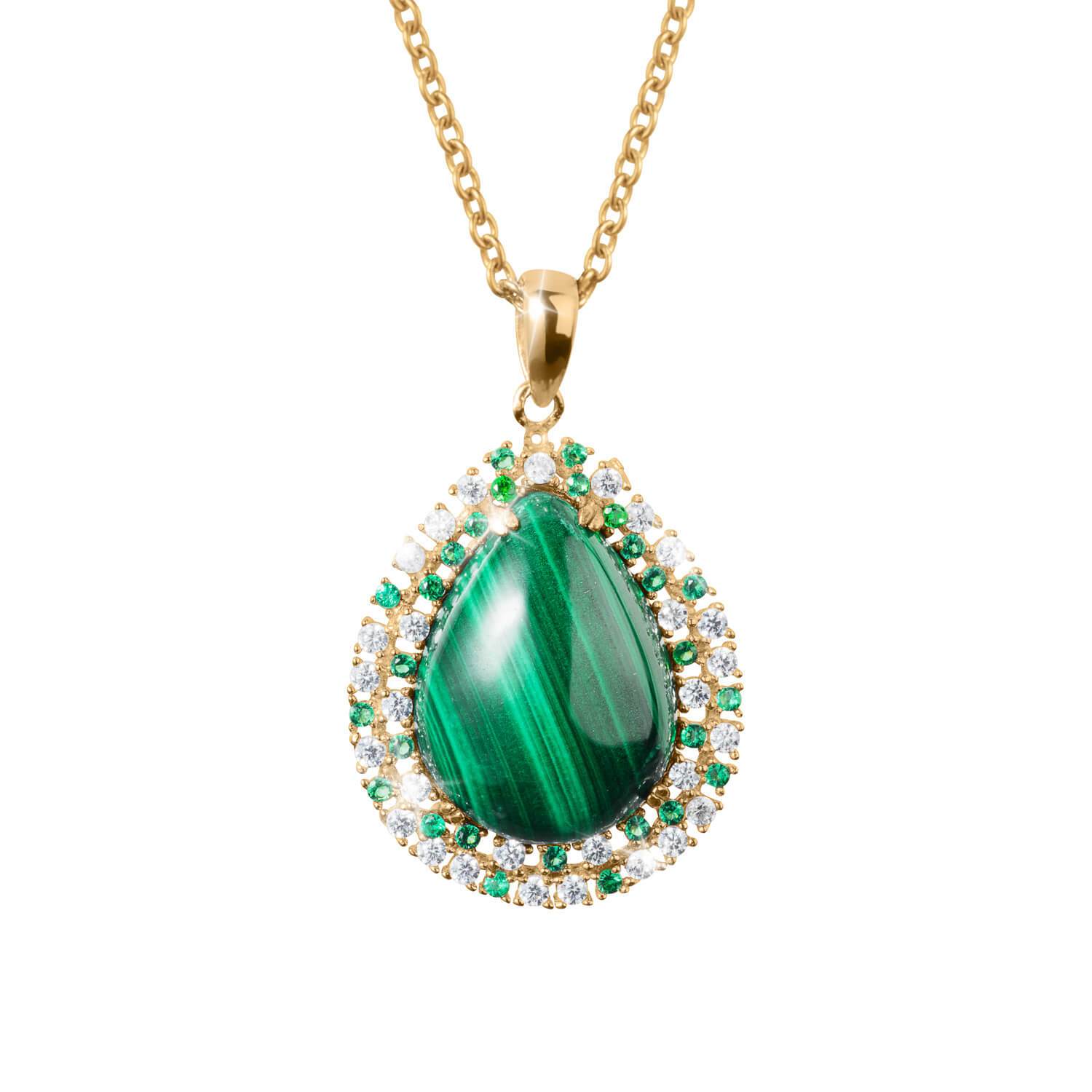 Malachite is a gorgeous green gemstone. Its light and dark green bands are very distinctive. It is said that Malachite can be worn to detect impending danger and it is believed to lend extra energy and bring harmony into one’s life. Crafted from sterling silver, plated in rich yellow gold suspends a teardrop of Malachite surrounded in shimmering white Diamondeau®, flawless simulated diamond.