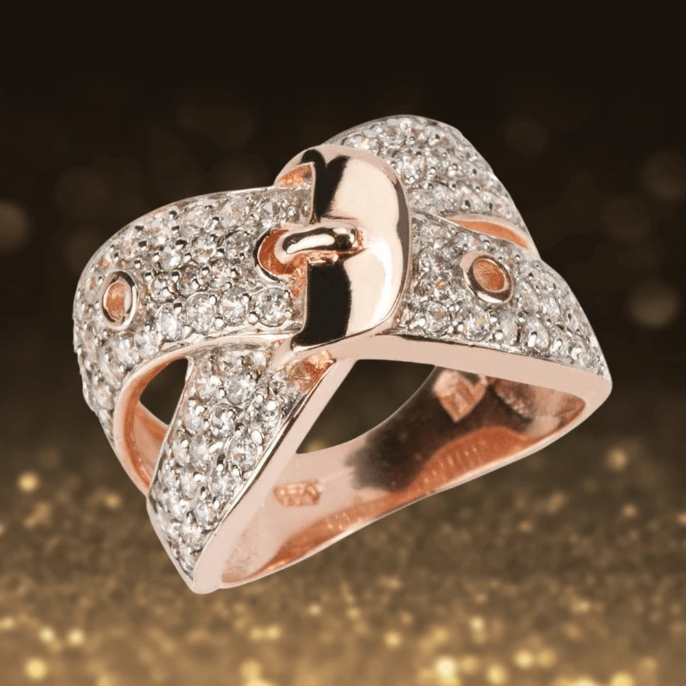 81 of our flawless Diamondeau® - flawless simulated diamonds are individually set into this unique ring. Crafted from solid 925 Sterling Silver before being richly plated in warm Rose Gold . The giving of a buckle ring has long been associated as a symbol of securing love and commitment in a special relationship. Equally it can be seen as a special friendship ring or indeed simply a gorgeous and fashionable piece of fine jewelry.