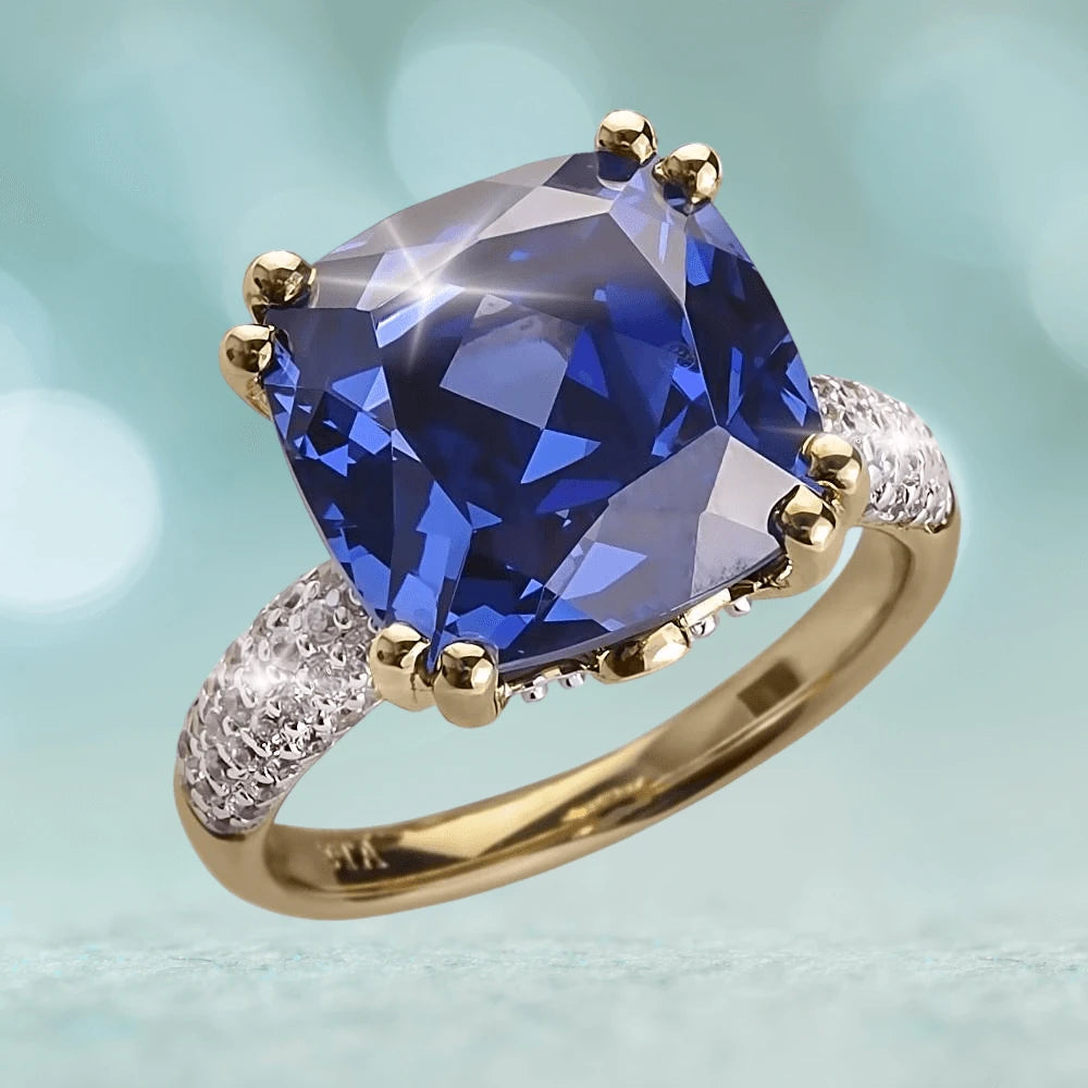 Sapphires are known and desired world over but in North America the biggest deposits of natural Sapphire are found in Montana and the fanciest of which are from a little known place called Helena which gave us the inspiration for this brand new addition to our Sapphire collection. At an impressive 7.5 carats in size the central deep blue Diamondeau® - flawless simulated diamond is as eye catching as it gets. The unique faceting means the depth of sparkle to this stone is endless. We didnt miss a trick pave setting our trademark Diamondeau® into the crown and shoulders, giving a seamless finish. Each ring is set in solid 925 Silver and lavishly plated in rich 18ct Yellow Gold.