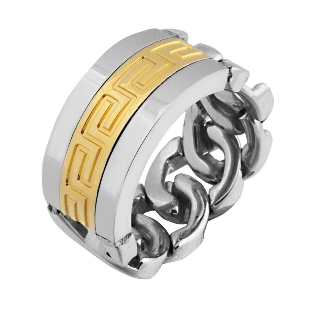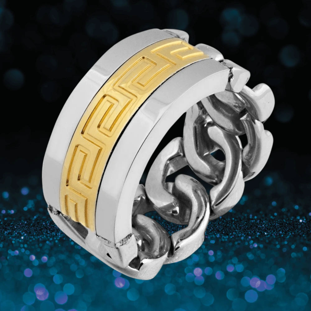This ring features one of the oldest designs on the planet, the Meander pattern. It has been incorporated into this contemporary men's ring which has been engineered from the best premium grade 316L solid Stainless Steel. A sculpted stripe plated in 18K Yellow Gold and the flexible chain back, gives this ring a real designer feel.
