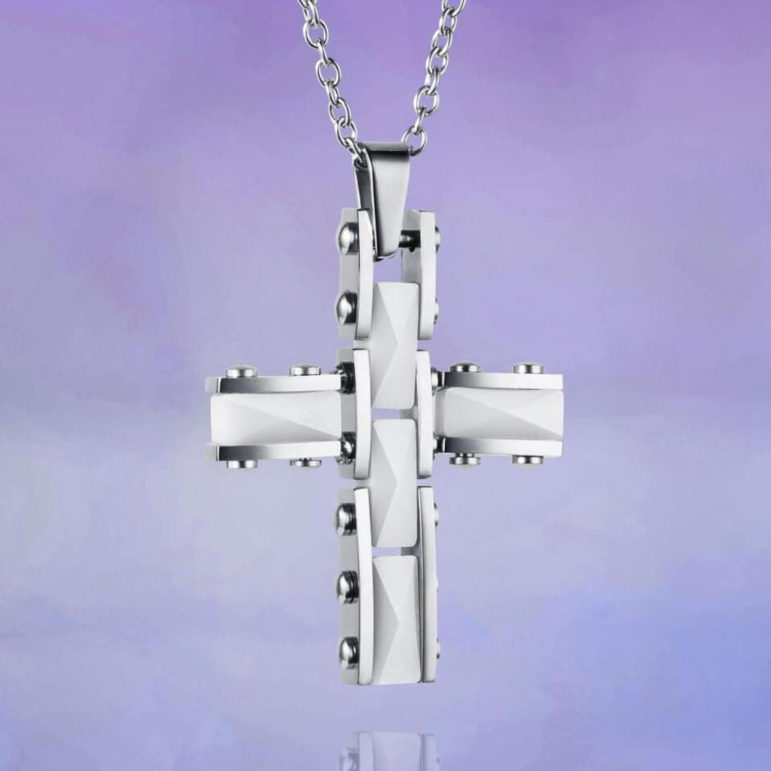Make a bold statement with these eye catching movable cross pendants. Expertly crafted, this design features a crystal white ceramic cross wrapped in a stainless steel polished embrace. Ceramic is the perfect material for these pendants, cool to the touch, extremely strong and able to take a high polish which suits this design perfectly