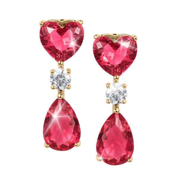 Dazzle from every angle with these stunning drop earrings, finished in lustrous yellow gold and crafted to capture light and admiration alike. Each earring mirrors the graceful arrangement of the necklace, featuring alternating drop Diamondeau®, flawless simulated diamond stones with one design combining a rich red heart, a sparkling white round gem, and a vivid red pear drop, while the other showcases a cascade of brilliant white stones ending in a pear-shaped flourish. Designed to sway with elegant movement, they sparkle with every turn of the head. The deep red tones and symbolic heart shapes evoke a story of romance; a celebration of passion, devotion, and timeless love. Whether worn to mark an unforgettable moment or given as a meaningful gift to someone cherished, these earrings will carry sentiment in every shimmer.