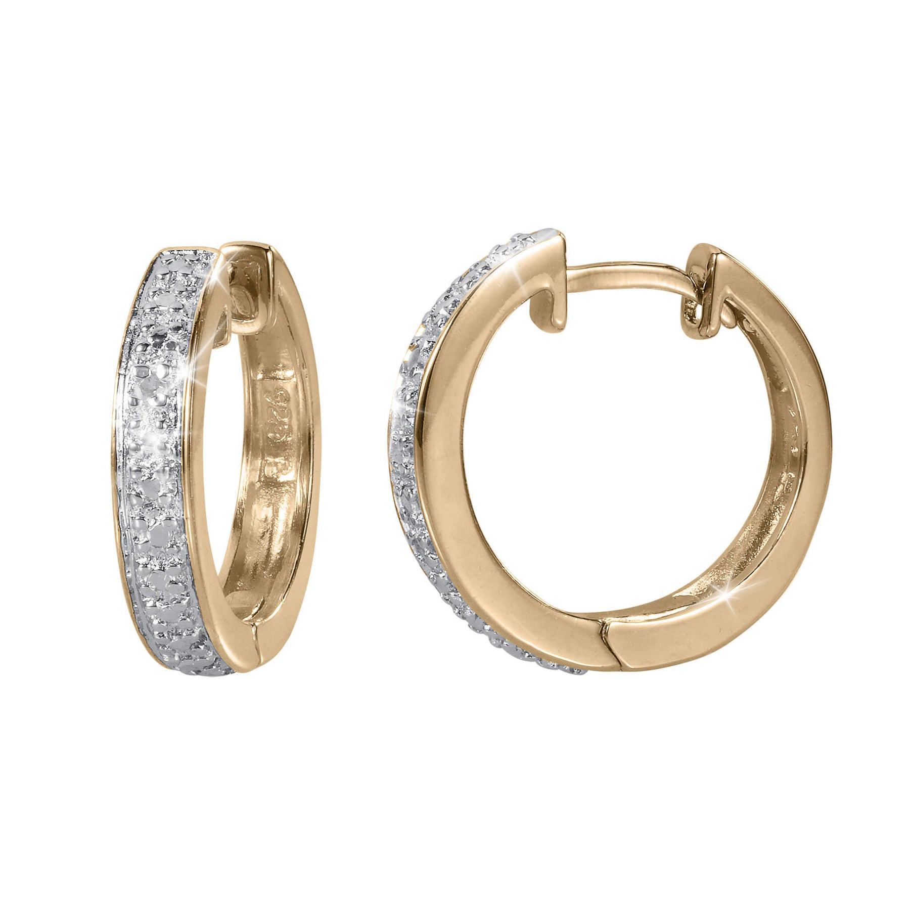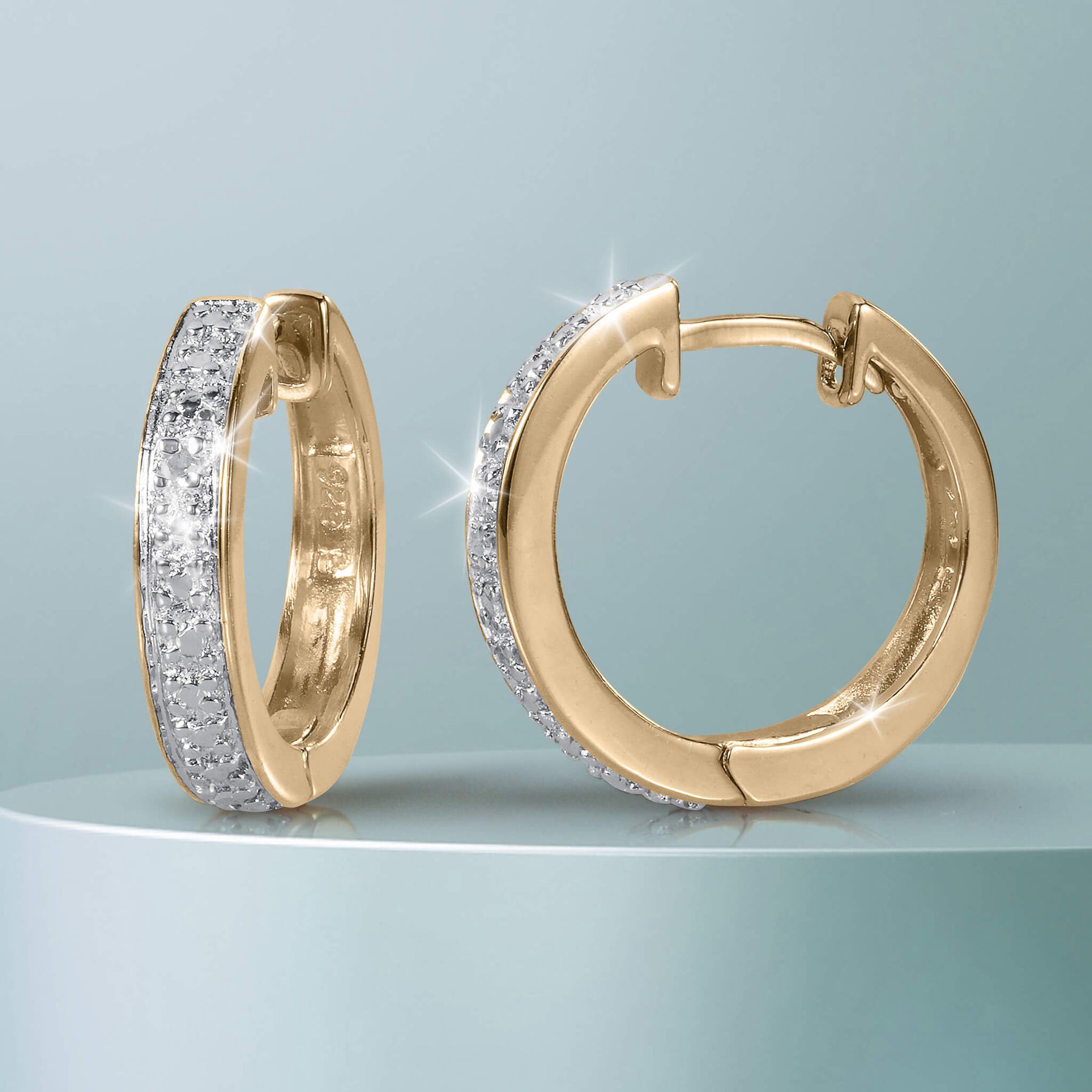 Enhance your elegance with these sterling silver hoops, masterfully finished in radiant 18k yellow gold. These luxurious hoops are meticulously set with sparkling diamonds, creating a captivating interplay of light and brilliance with every movement. Designed to complement any ensemble, these earrings seamlessly transition from day to night.