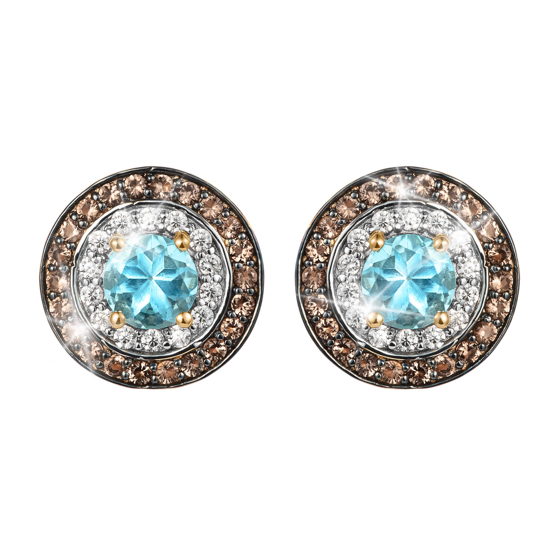 Introducing the timeless beauty of our Blue Topaz Horizon Earrings, crafted from the finest sterling silver, finished in 18k yellow gold, featuring a stunning blue topaz stone at the center. The blue topaz radiates a calming oceanic aura, surrounded by a halo of sparkling white Diamondeau®, flawless simulated diamond, adding a touch of sophistication. A second halo of brown shimmering gems with a black rhodium finish, adds an extra layer of glamor to this exquisite piece. This pair  is a versatile design making it suitable for any occasion.