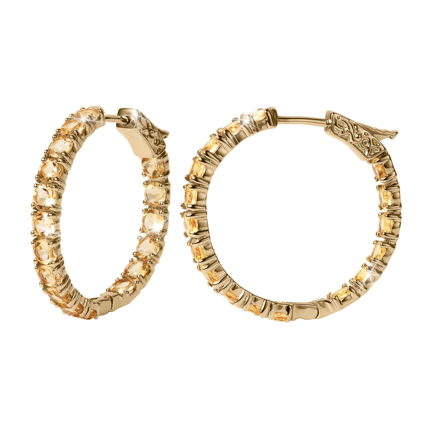 Journey through your day with these in and out hoop earrings, a classic piece that will add a touch of luxury to any look. Finely crafted from sterling silver with an 18k yellow gold finish. Beautiful Citrine, brilliant round cut stones sparkle at the heart of this design.