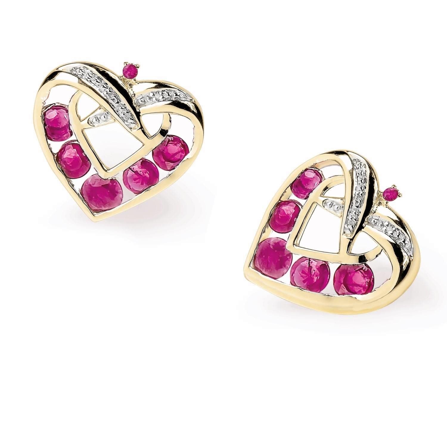 Each ruby is a round brilliant cut and a blaze with fire and passion. The earrings are intricately formed in sterling silver and finished in yellow gold, handset with stunning rubies, and finished with sparkling natural round diamonds, all sealed with a tender kiss, a real token of your affections; and a perfect gift.