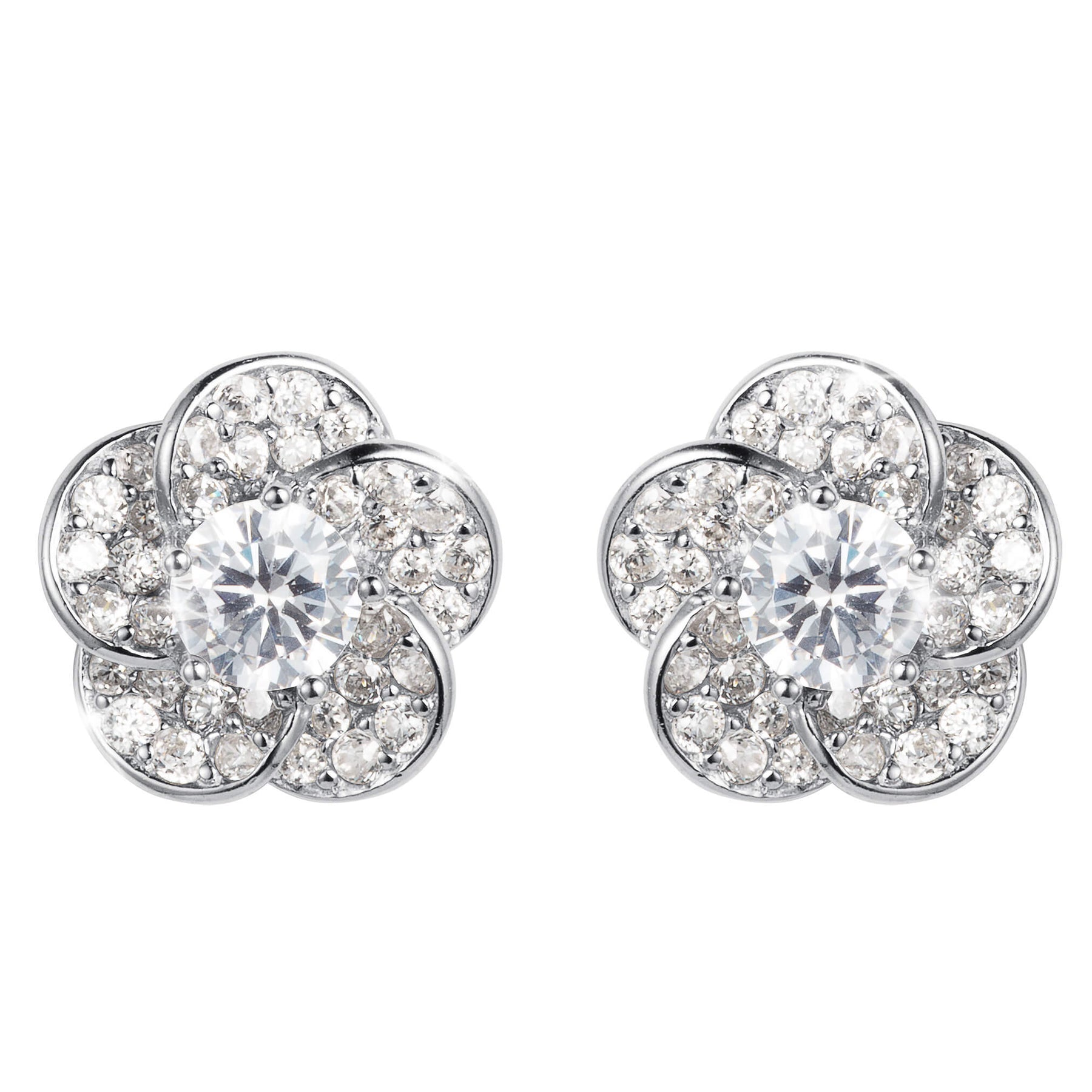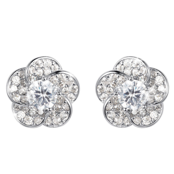 Crafted in a delicate flower-shaped design, each earring features a round brilliant solitaire Diamondeau®, flawless simulated diamond at its center, surrounded by petals adorned with even more shimmering gems. Perfect for making a statement this party season, these earrings catch the light from every angle. Whether for a special occasion or everyday glamor, these earrings bring a radiant, feminine touch to any ensemble.