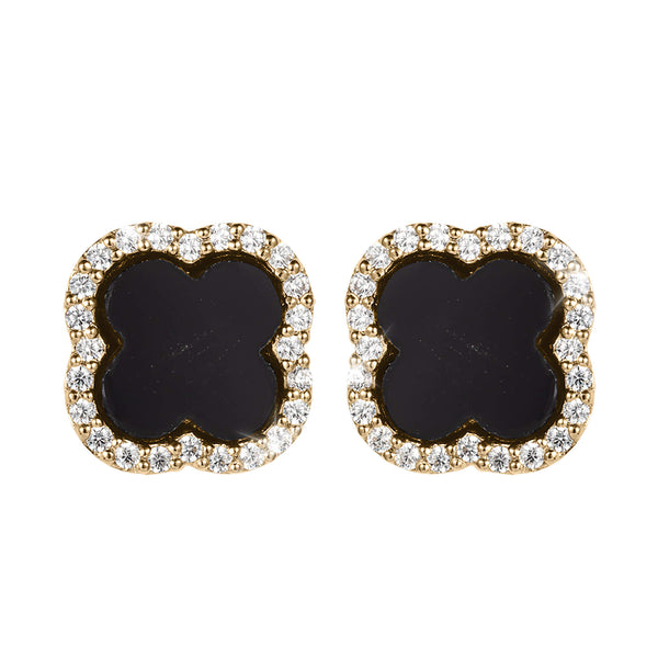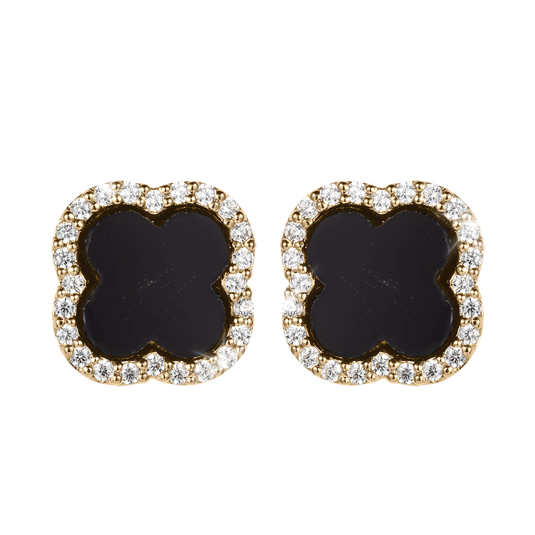 Step into a world where elegance meets timeless charm with these enchanting onyx earrings. Featuring a delicate four-leaf clover design, each earring is beautifully outlined by a halo of clear, sparkling Diamondeau®—our flawless simulated diamonds—catching the light with every movement. At the heart of each clover rests a rich black onyx stone, symbolizing strength and protection. Crafted in sterling silver and finished in luxurious yellow gold, these earrings blend classic sophistication with modern flair. Perfect for special occasions or as a bold everyday accent, they bring a touch of elegance and luck to any look.