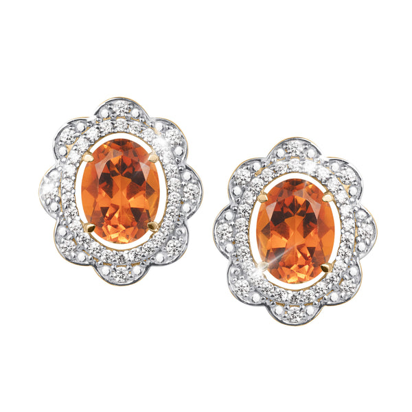 Immerse yourself in radiant elegance with these exquisite earrings, expertly crafted in sterling silver with an 18k yellow gold finish. Each earring features a captivating oval Citrine at its center, surrounded by a sparkling halo of Diamondeau®, flawless simulated diamond. A delicate scalloped outer halo, accented with additional shimmering stones, adds depth and sophistication. Thoughtful design touches, including subtle caramel colored gem accents, perfectly enhance the central Citrine, amplifying its golden glow and honeyed hue. Citrine is celebrated for symbolizing abundance, joy, and positive energy, inspiring confidence and optimism wherever it is worn.