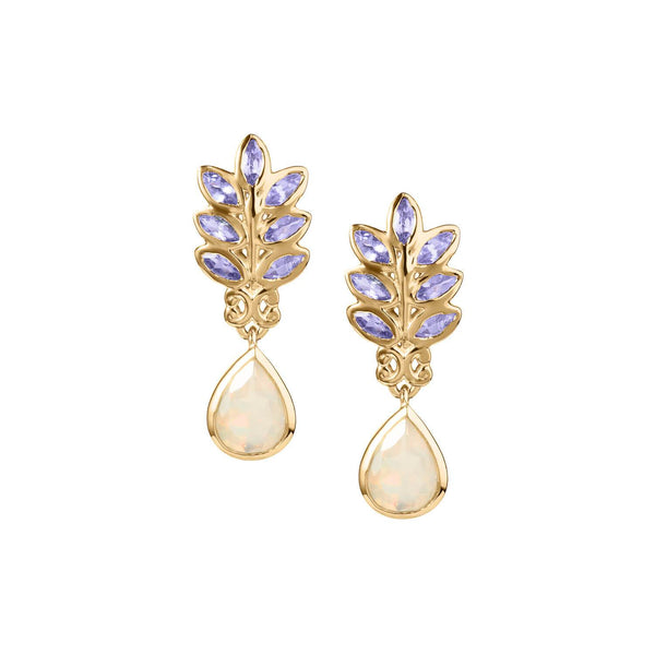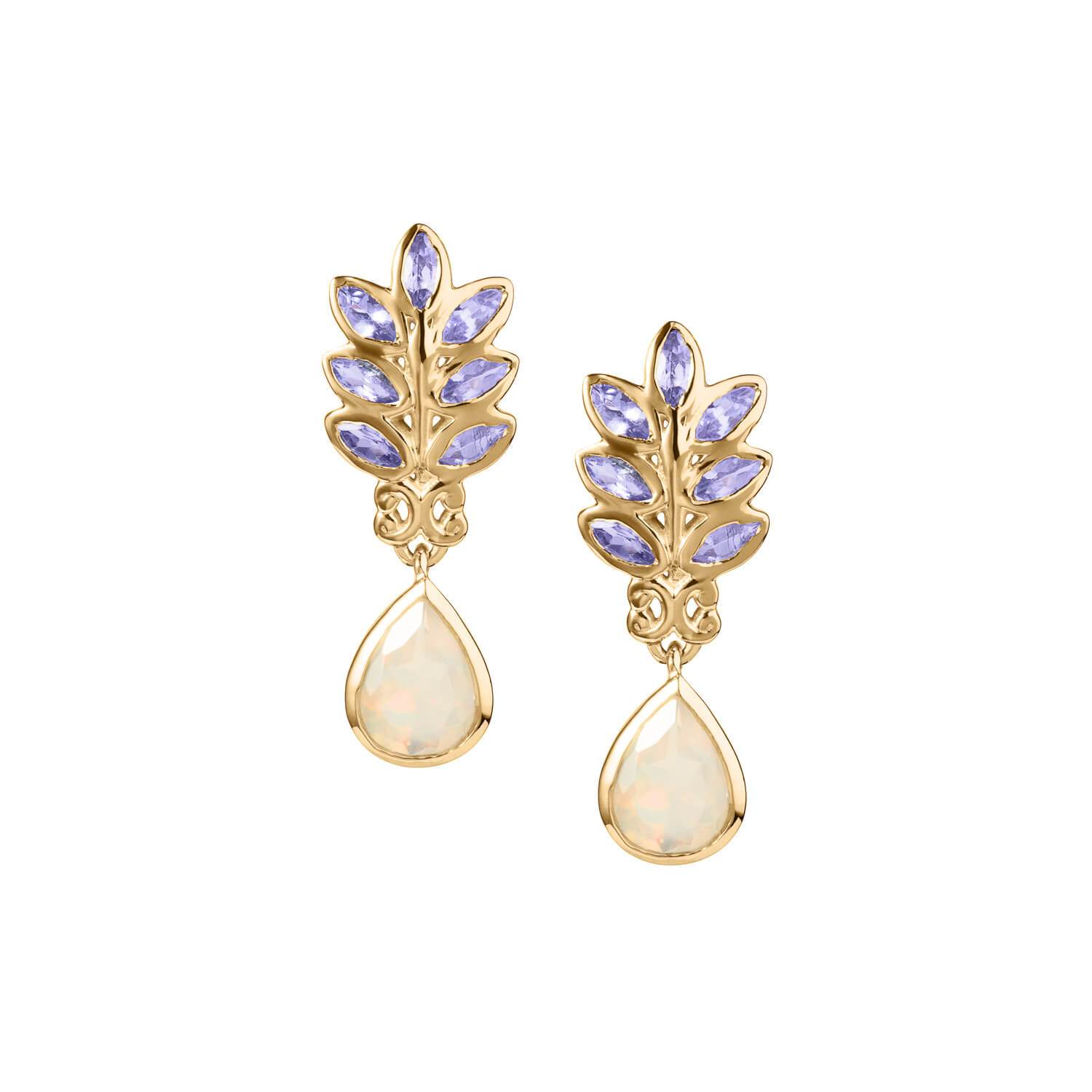 Wow her with this striking collection. A pendant, earring and ring set that commands real attention. The magnificent iridescent pear shaped Opal is the main focal point and sure to impress. Opal possesses flashes of rainbow colors that change with the angle you look at them, gloriously complemented with beautiful marquise cut Tanzanite. Tanzanite is rarer than diamonds and only found in one place, Tanzania. This glamorous look is sure to be one you'll turn to often.