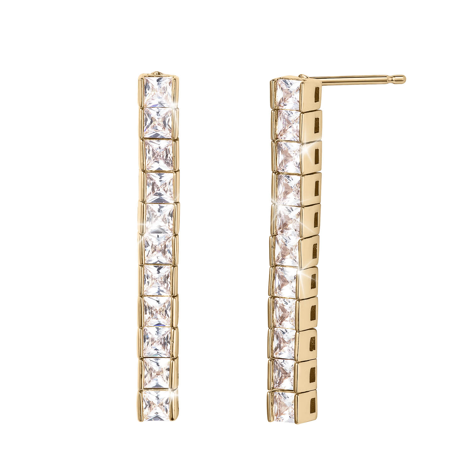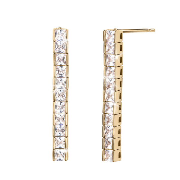 The Princess Earrings embrace the elegant and feminine quality of princess cut gems. Expertly crafted and finished in yellow gold this stunning pair showcases an endless row of shimmering ice white Diamondeau®, flawless simulated diamond.