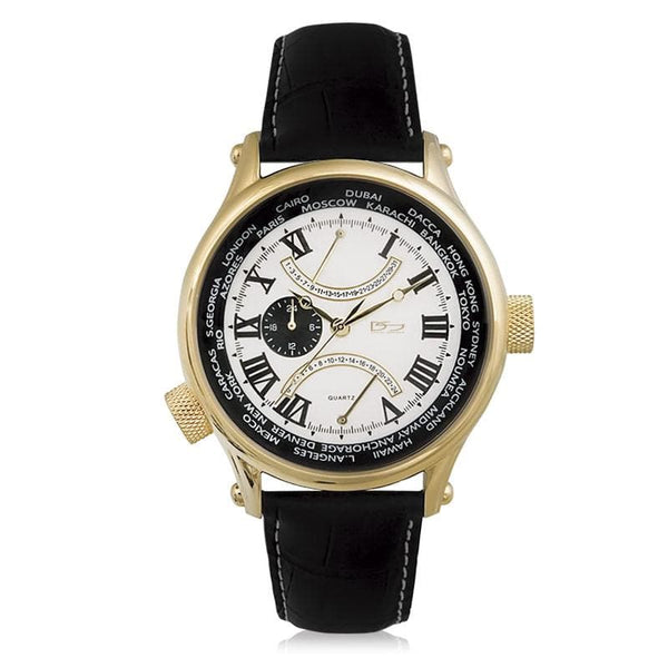 We have built this watch from the movement up, no expense spared. Our new retrograde expert watch would come very highly recommended and be the perfect watch to balance between the office and fashionable conversation piece. Formed from premium grade stainless steel, finished in yellow gold the watch is attached to your wrist with a luxurious genuine leather strap. The ingenious precision movement features useful functions such as date hand, 24 hour indication and 24 hour window in an unusual retrograde dial.  Complete with presentation box.