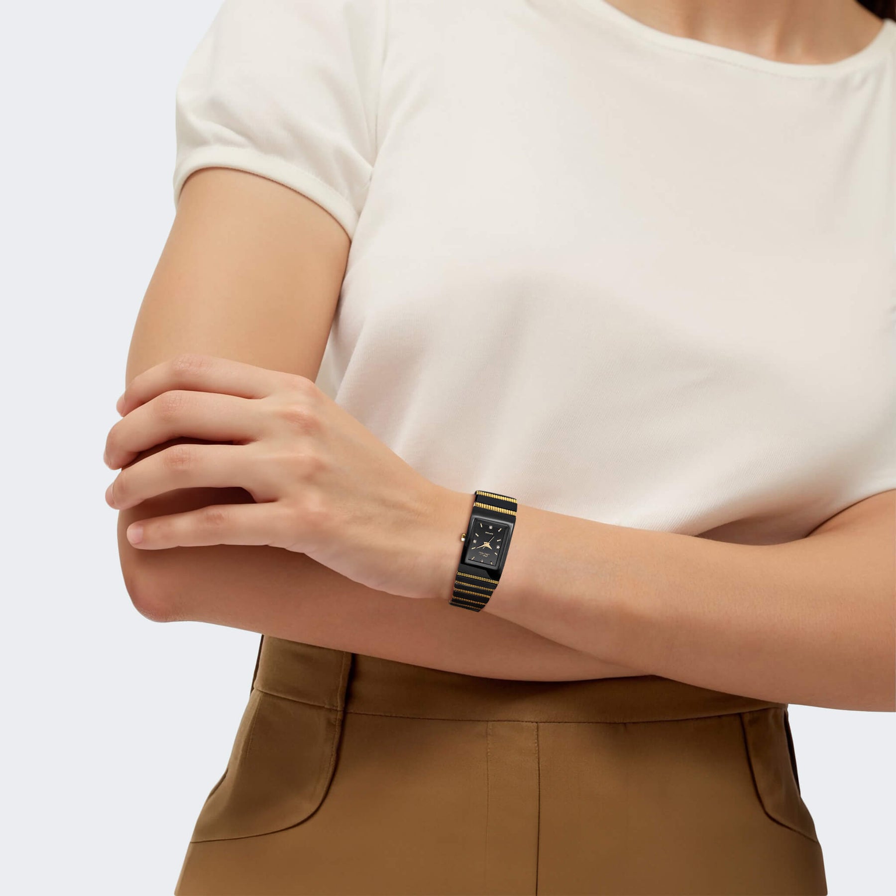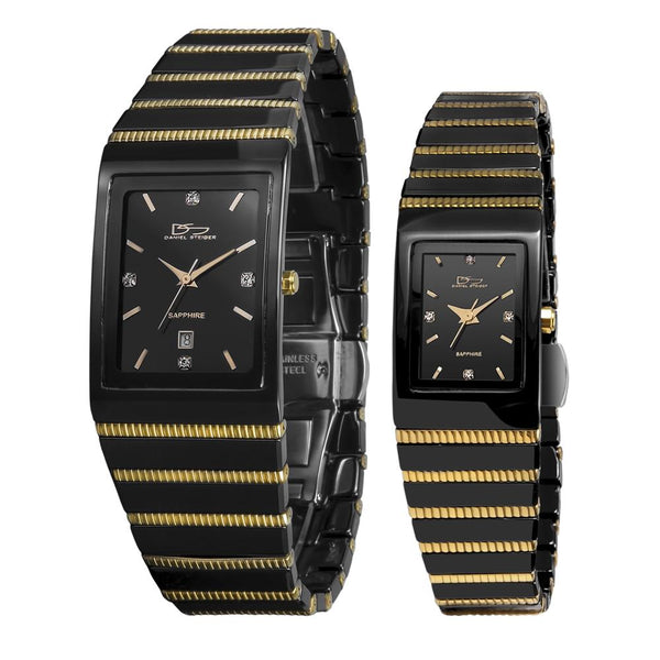 Inspired by the exotic stripes of a King Cobra our latest pair of watches is guaranteed to strike it big on the design front. The perfectly polished minimalist black ceramic case and bracelet also means you are covered as far as excellent quality goes. We of course go that extra mile by adding gold plated solid stainless steel detailing and a precision quartz date movement that is backed with our unlimited 5 year movement warranty. A final touch of luxury is the designer dial covered with a scratch resistant sapphire crystal and studded with 4 of our flawless Diamondeau® - flawless simulated diamond. Both bracelets are fully adjustable and come with a double release butterfly buckle.