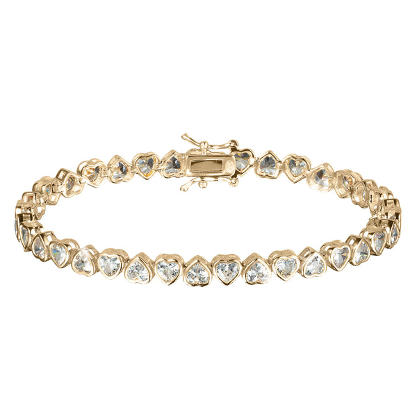 A symbol of love that knows no bounds, this exquisite bracelet is a graceful expression of elegance and devotion. Crafted from sterling silver and finished in radiant yellow gold, it features a continuous line of heart-shaped Diamondeau®, flawless simulated diamond stones, each securely embraced in a sleek bezel setting. The alternating orientation of the hearts creates a mesmerizing rhythm, capturing light from every angle for an endlessly brilliant sparkle. Whether worn alone or layered, this bracelet is a timeless treasure, perfect as an elegant reflection of love and grace.