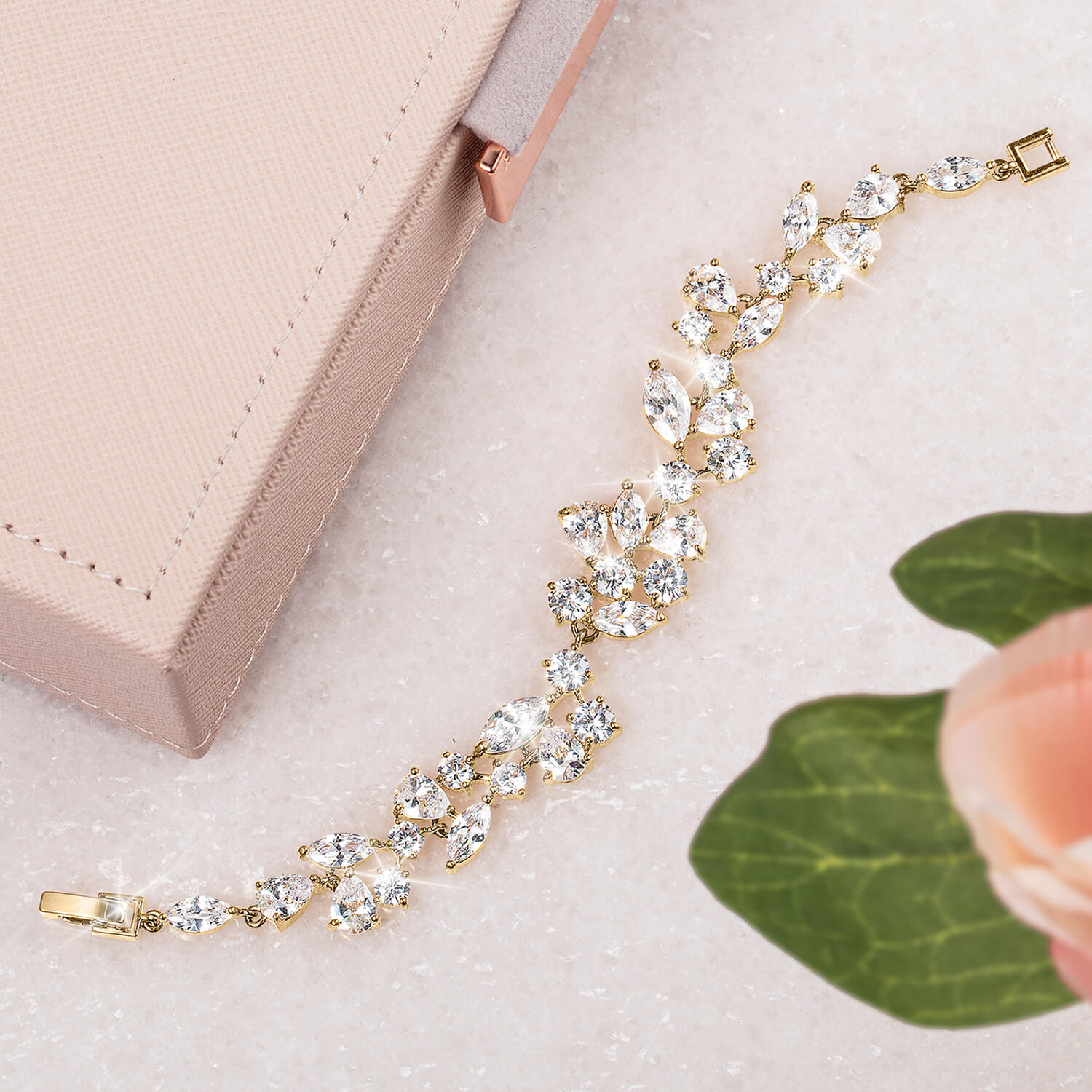 Dress her wrist in a new level of sophistication with this chic bracelet. Finished in gold, this shimmering design features marquise, round and pear cut Diamondeau®, flawless simulated diamond, each placed in an organic setting to flow perfectly around your wrist with almost 14 carats. Add that stylish shimmer to your outfit.