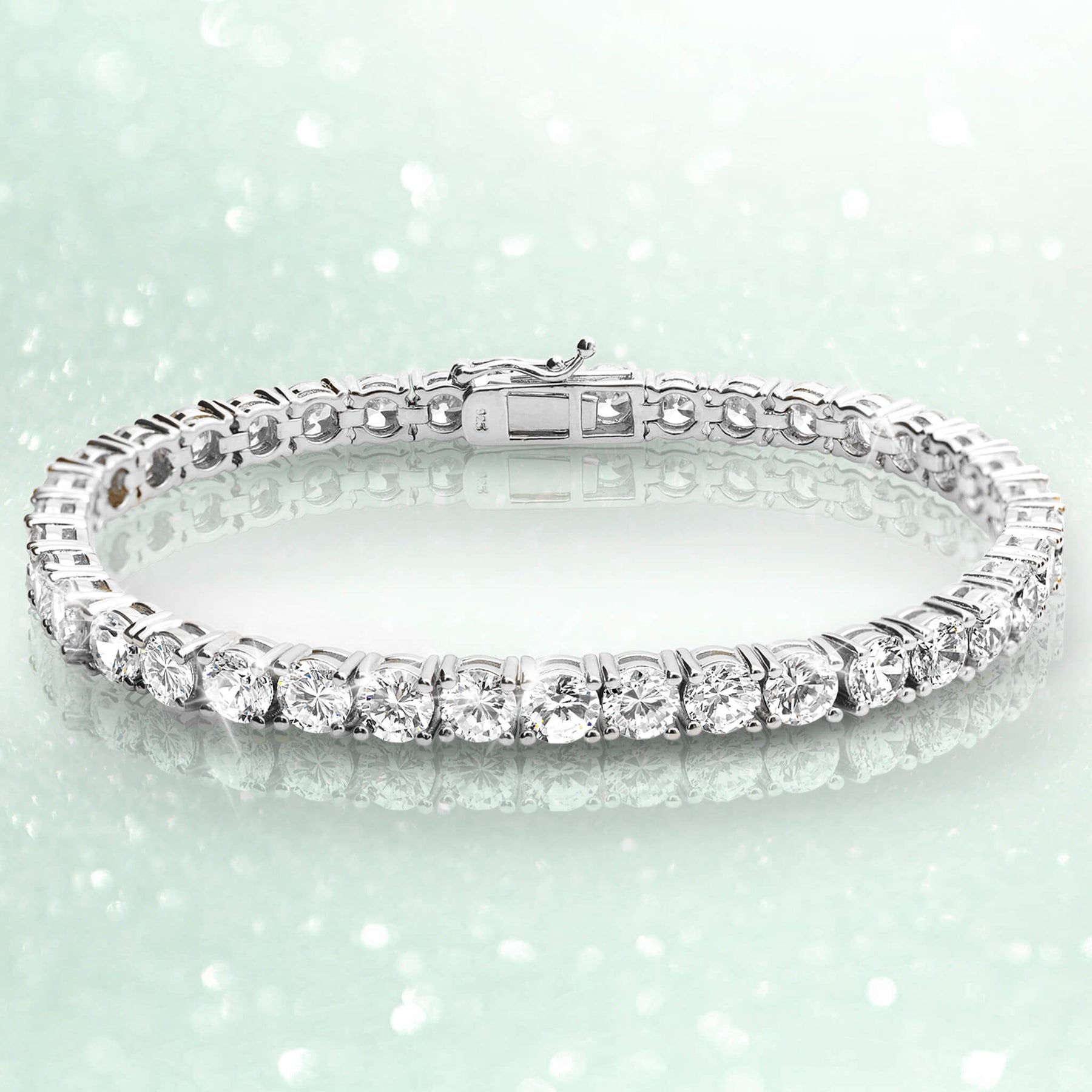 Every lady should own a tennis bracelet. This classic piece of jewelry is just the right, believable size. Crafted from finest sterling silver, plated and expertly set with white Diamondeau®, flawless simulated diamond. Flawless and completely adaptable to suit any outfit. The perfect combination.