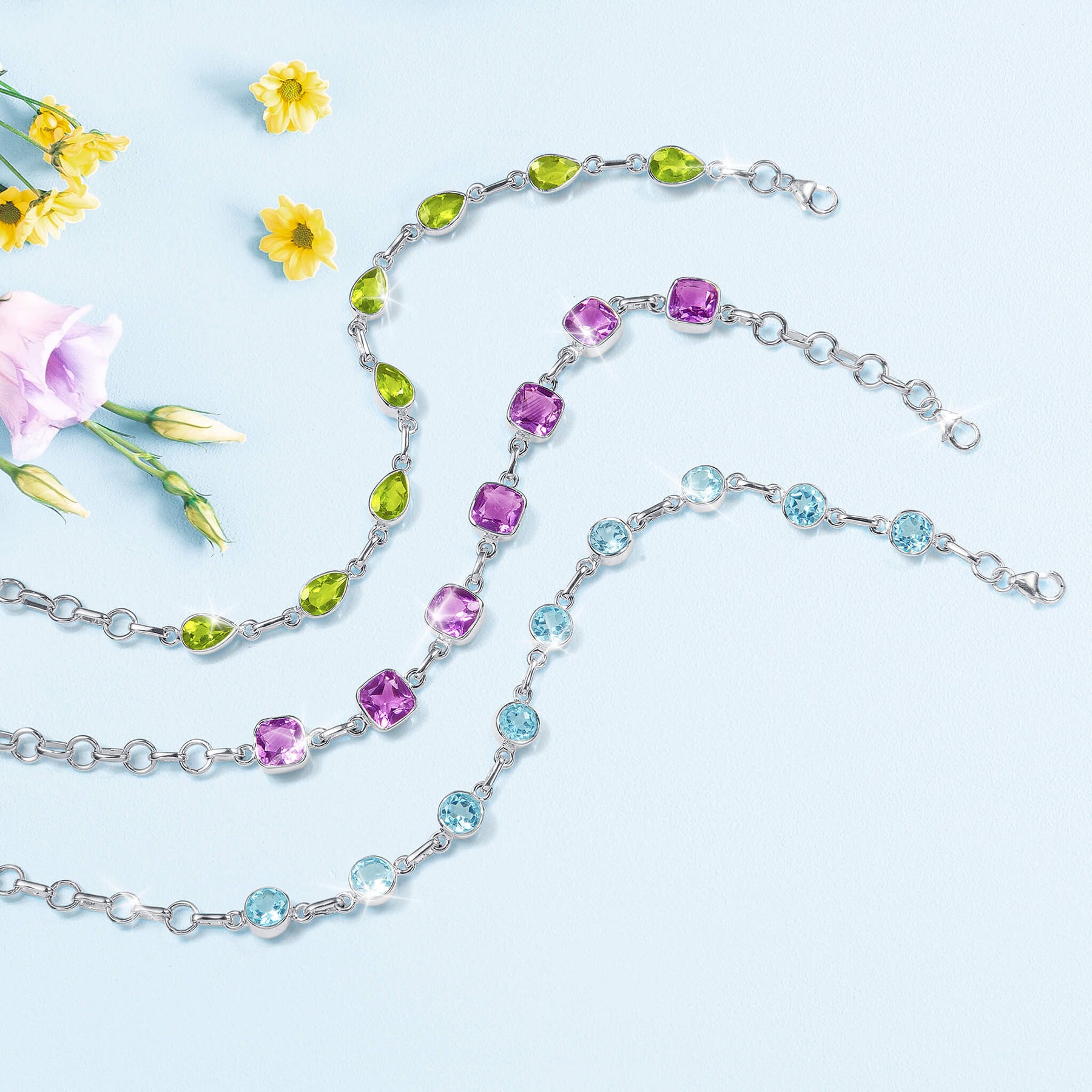 Add a pop of color to your summer wardrobe with these stunning bracelets. choose from the beautiful hues of Amethyst, Peridot, and Blue Topaz stone in various cuts, to bring a touch of elegance to any outfit. Each bracelet is crafted from the finest sterling silver and polished to perfection. Whether you're dressing up for a soirée or simply adding a touch of glamor to your everyday look, these bracelets are the perfect way to add a pop of color to your wardrobe. So why wait? Choose your favorite gemstone and add a touch of elegance to your wrist today!