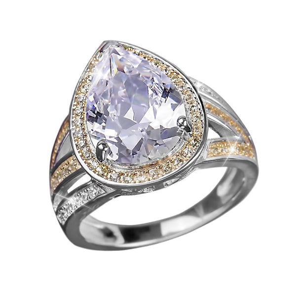 A gorgeous designer combination of our flawless brilliant white vanilla Diamondeau® - flawless simulated diamonds. A magnificent 4 carat pear cut dazzler is surrounded by a halo of round brilliant cuts gems. The 2 tone solid 925 Sterling Silver mounts are the perfect setting for such gorgeous gems that rate so highly on the Mohs scale of hardness that they can even cut glass like a mined Diamond. Available in size 5 to 10, magnificent presentation case included.
