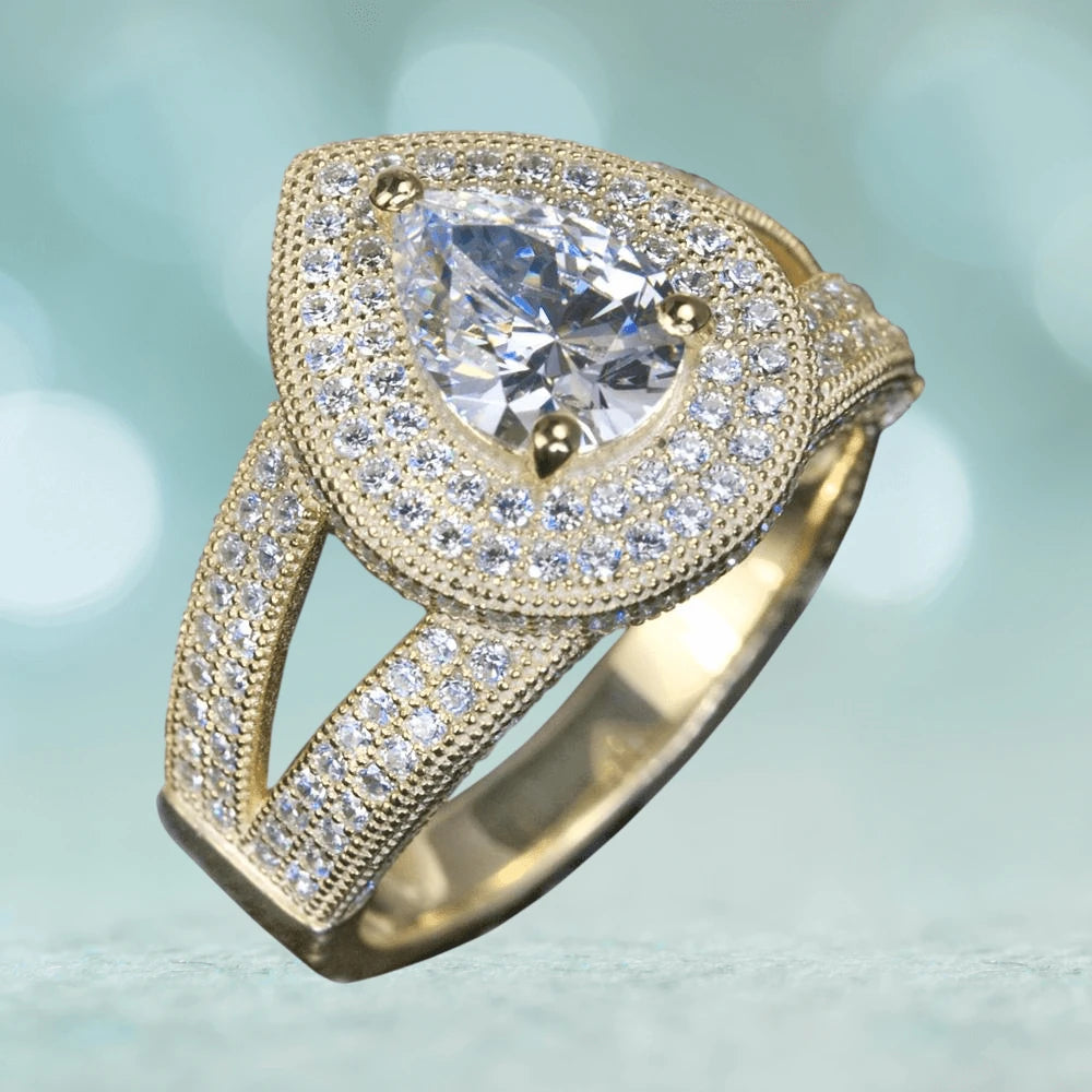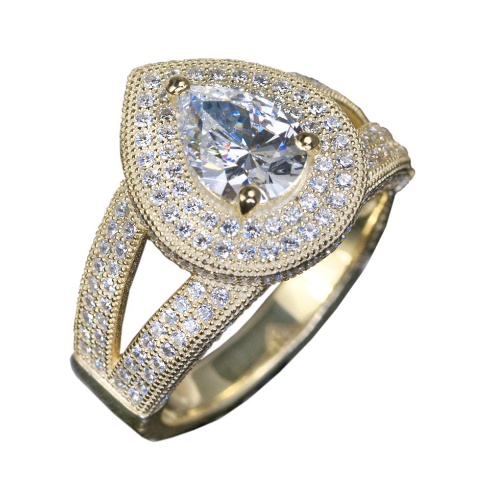 At 530.20 Carats, the Cullinan I or Star of Africa is the largest cut diamond in the world. Pear shaped, with 74 facets, it is set in the Royal Scepter, part of the Crown Jewels in the Tower of London. It was cut from the 3,106-carat Cullinan, the largest diamond crystal ever found. Legend suggests that it may have been part of a much larger rough Diamond. Our Cullinan Collection is inspired by gems that could have been cut from this missing piece of priceless history. We have used only the finest solid 925 Sterling Silver lavishly plated in 18k Yellow Gold and set with our brilliant round cut lab-Diamondeau® - flawless simulated diamonds plus matching pear cut gems.