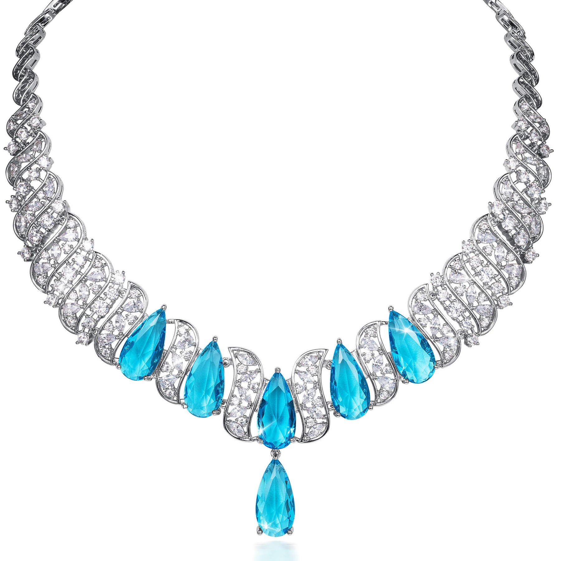A breath-taking piece that combines bold design with exquisite detailing. The stunning necklace features light blue, pear shaped stones, each set to capture and reflect light beautifully. Intertwined with dazzling ice white Diamondeau®, flawless simulated diamond, the intricate swirls create a captivating interplay of sparkle and color.