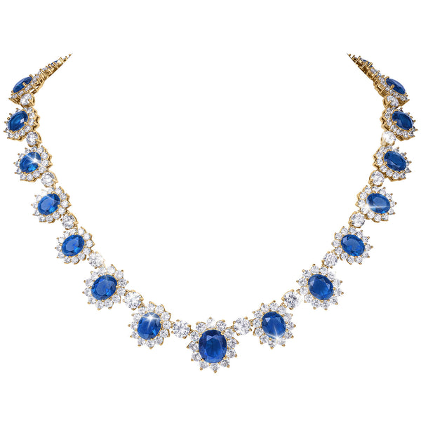 Create a glamorous look with our statement party season ready collection. Expertly finished in elegant yellow gold, this chunky necklace is beautifully crafted using oval deep blue Diamondeau®, flawless simulated diamond that sit perfectly around your collarbone and are encased in a halo of ice white shimming gems. Pair with the matching drop earrings to be the Belle of the ball this party season.