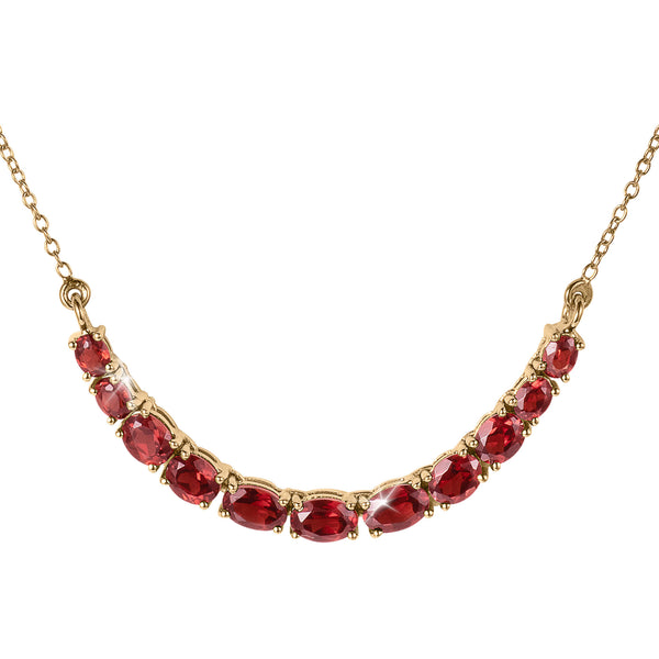 Celebrate elegance and sophistication with this exquisite Garnet necklace, thoughtfully designed to captivate. The necklace showcases eleven radiant Garnet stones, each oval stone in a unique size to enhance the piece’s natural beauty and add dimension. Set in fine sterling silver and beautifully finished in 18k yellow gold, the Garnet’s deep, passionate red contrasts against the warm golden hues.