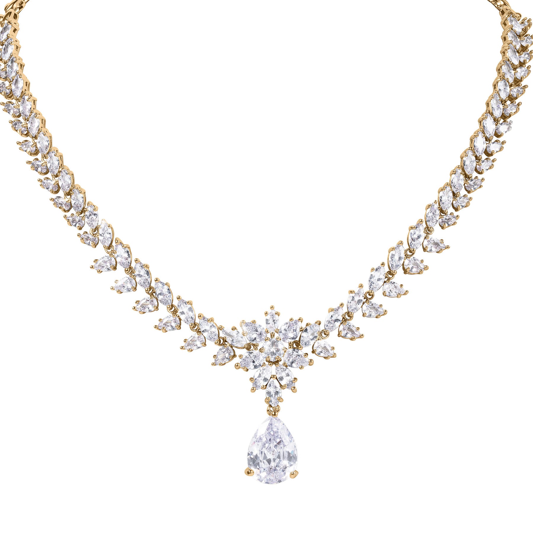 Indulge in the luxury of this stunning ladies necklace, where timeless elegance meets contemporary glamor. This finely crafted necklace is lavishly finished in radiant yellow gold, offering a warm, sophisticated glow that complements any ensemble. The design features a dazzling array of pear, round and marquise cut stones, each meticulously set with ice white Diamondeau®, flawless simulated diamond, to create a harmonious display of brilliance.