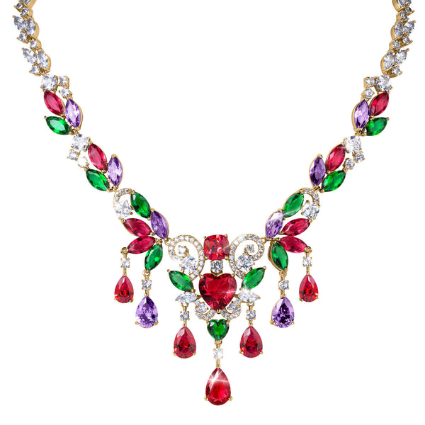 Indulge yourself in this shimmering bonanza. This collection oozes style and sophistication and is sure to make you stand out in a crowd. Glistening colorful white, purple red and green cut Diamondeau®, flawless simulated diamond cascade your neckline. The collection is given a truly decadent feel with a glimmering gold finish. Complete the look with the matching earrings for the ideal statement set.