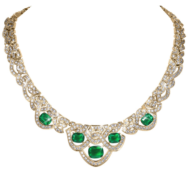 Turn heads and steal the spotlight with this exquisite necklace, the epitome of luxury and elegance. Finished in lustrous yellow gold, it is adorned with a mesmerizing combination of green and white Diamondeau®, flawless simulated diamond stones. The vibrant green stones evoke the beauty of lush landscapes, while the pristine white stones offer a touch of timeless brilliance. Perfect for an unforgettable night out, this necklace is your ultimate statement of sophistication and style.