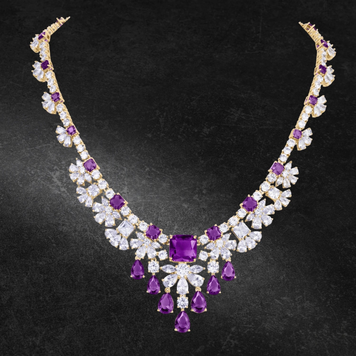 This charming collection is perfect for a special occasion. A cascade of ice white and vivid violet shimmer across your neckline and sparkle from your earlobe. Just over 80 carats of these delightful gems in classic cushion, pear and round cuts are handset into this piece. Finished in luxurious 18k yellow gold, adds the final touch to this superb collection.