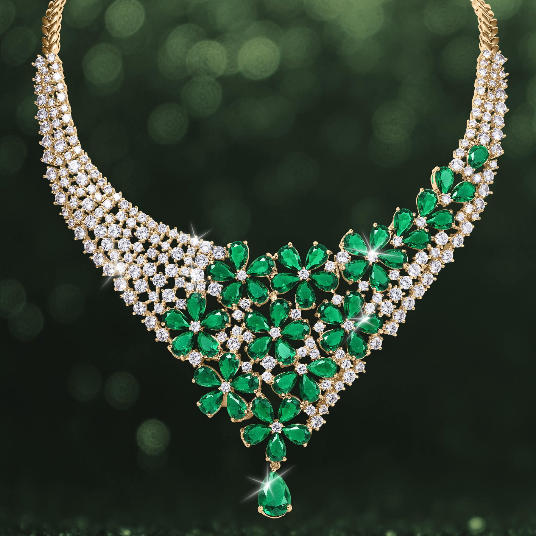 Designed to captivate, this stunning necklace, finished in lustrous yellow gold, radiates bold elegance and timeless sophistication. It showcases a wide, decorative collar that elegantly tapers toward the neck. A breathtaking display of pear-shaped emerald green Diamondeau®, flawless simulated diamond stones, are arranged into graceful floral clusters that ascend along one side. Suspended at the center, a larger pear-shape gem hangs gracefully, serving as an elegant focal point. Surrounding the floral arrangement, a pavé-like mosaic of shimmering white gems adds depth and radiant sparkle. Whether dressing for a special occasion or simply indulging in everyday luxury, this necklace delivers effortless glamor.