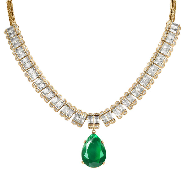 A radiant piece designed to elevate your elegance and captivate hearts. A carefully crafted chain finished in yellow gold, serves as a delicate frame, enhancing the allure of the shimmering Diamondeau®, flawless simulated diamond and providing a luxurious backdrop for the standout verdant pear drop stone. The design strikes a perfect balance between classic elegance and contemporary glamour, making it a versatile accessory for various occasions.