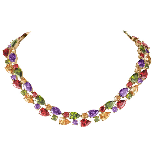 Designed to add a touch of elegance and color to your ensemble. A vibrant gold finished necklace is adorned with round and pear shaped sparkling Diamondeau®, flawless simulated diamond in shades of peach, green, red and purple. Create a harmonious ensemble that oozes sophistication and style.