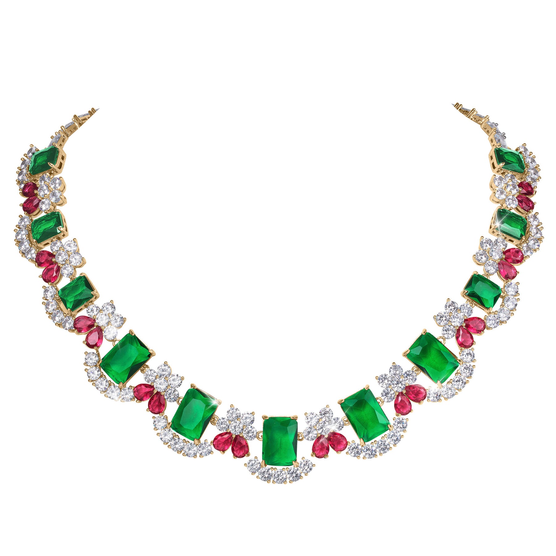 Make an unforgettable impression with this eye-catching necklace, a brilliant blend of color, radiance and timeless design. Finished in gleaming yellow gold, this design showcases a captivating arrangement of rich green, lively pink and classic white Diamondeau®, flawless simulated diamond stones, in an assortment of bold cuts, forming a charming floral inspired design. The necklace drapes gracefully along the neckline, delivering a bold and sophisticated look. Perfect as a gift or a show-stopping addition to your jewelry collection, this exquisite piece embodies the perfect harmony between nature’s beauty and expert design.
