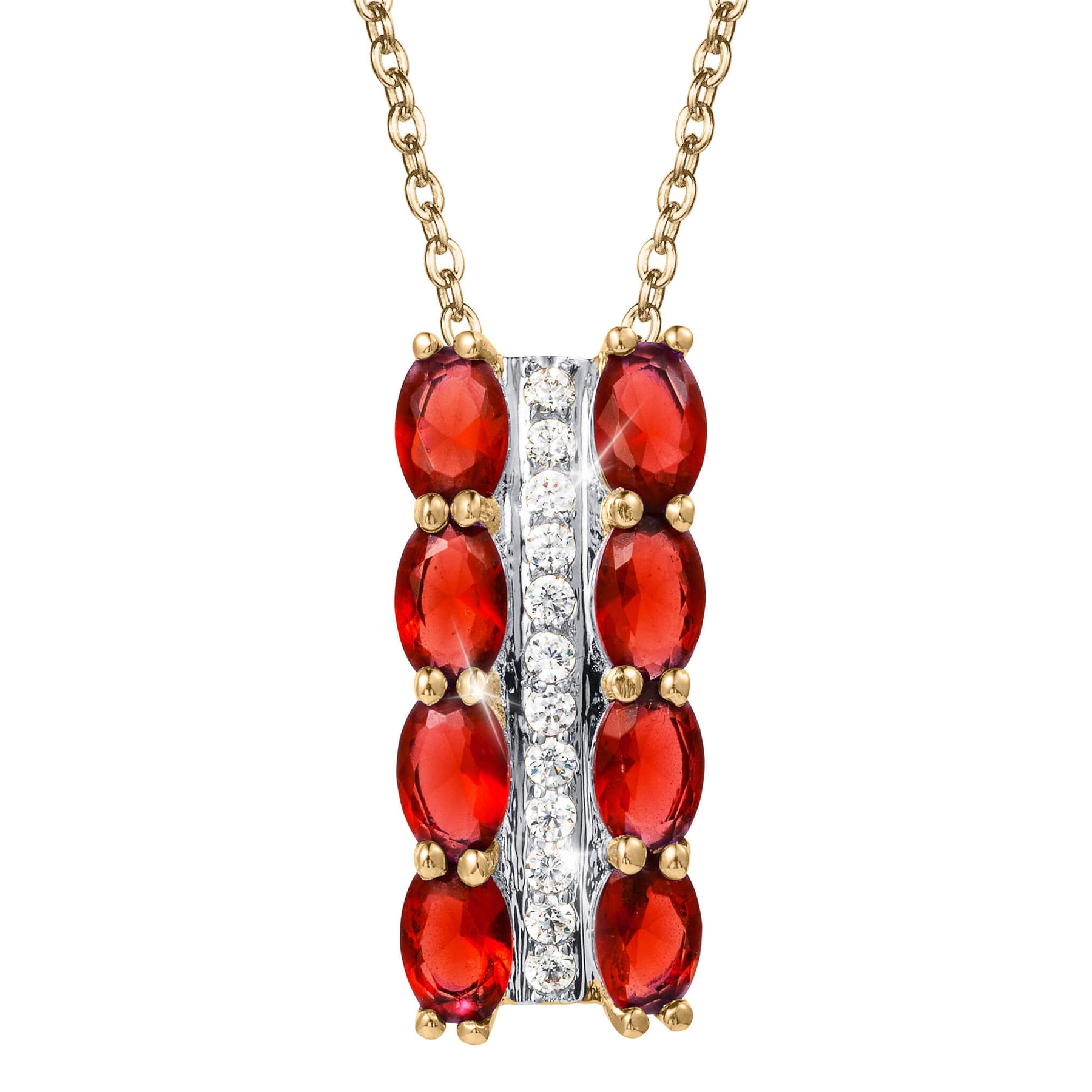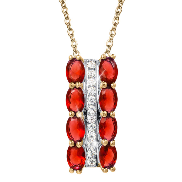 Glittering and incredibly glamorous, this gorgeous pendant features shimmering oval fiery red gems with added shimmering ice white Diamondeau®, flawless simulated diamond. Fashioned from sterling silver, gloriously plated in golden yellow gold. The ideal shimmering centerpiece for any occasion.