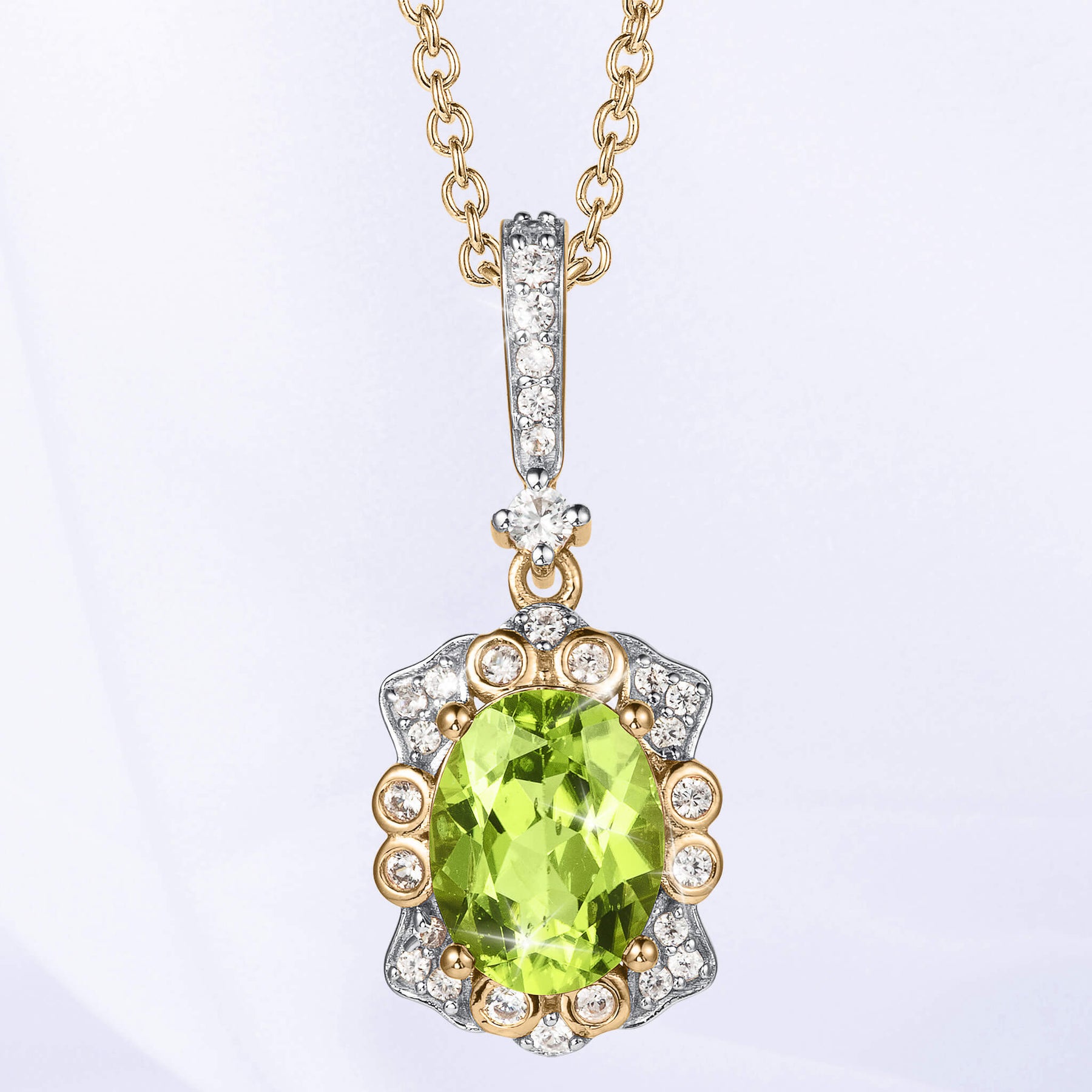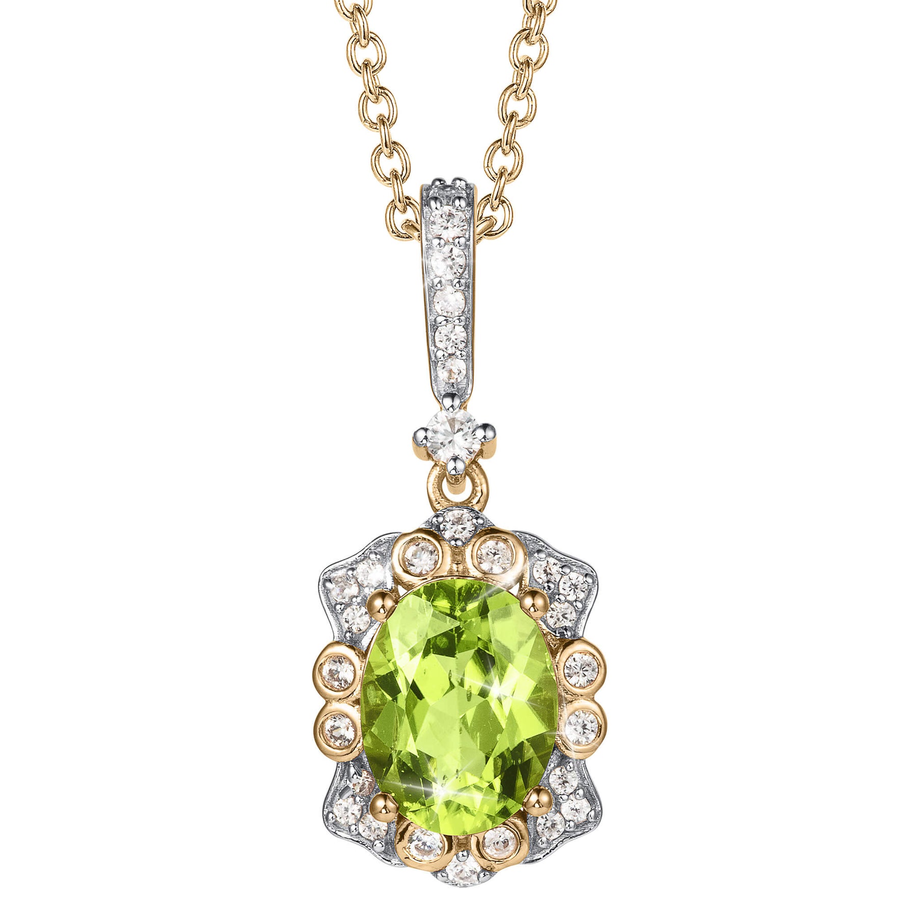 This stunning pendant is meticulously crafted from sterling silver and finished with an opulent 18k two tone finish. At the heart of each piece lies a captivating oval Peridot, renowned for its vibrant green hue. This enchanting gemstone is beautifully complemented by shimmering white Diamondeau®, flawless simulated diamond. Each pendant stands alone as a statement of beauty that is both timeless and modern. An ideal gift for an August birthday.